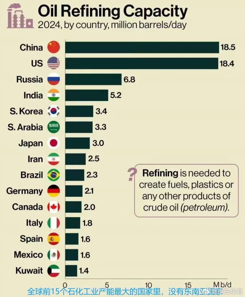除了新加坡拥有较强的原油加工能力、炼油产能约占东盟总产能的30%外,其他东盟国家的炼油能力都不强;在乙烯/烯烃之类的石油化工产业里,泰国是东盟的龙头,乙烯产量占东盟总产能的35%以上。但在全球石油化工产业的产能排行榜上,前15位没有东盟国家,中美并驾齐驱,把所有其他国家都远远甩在后面。