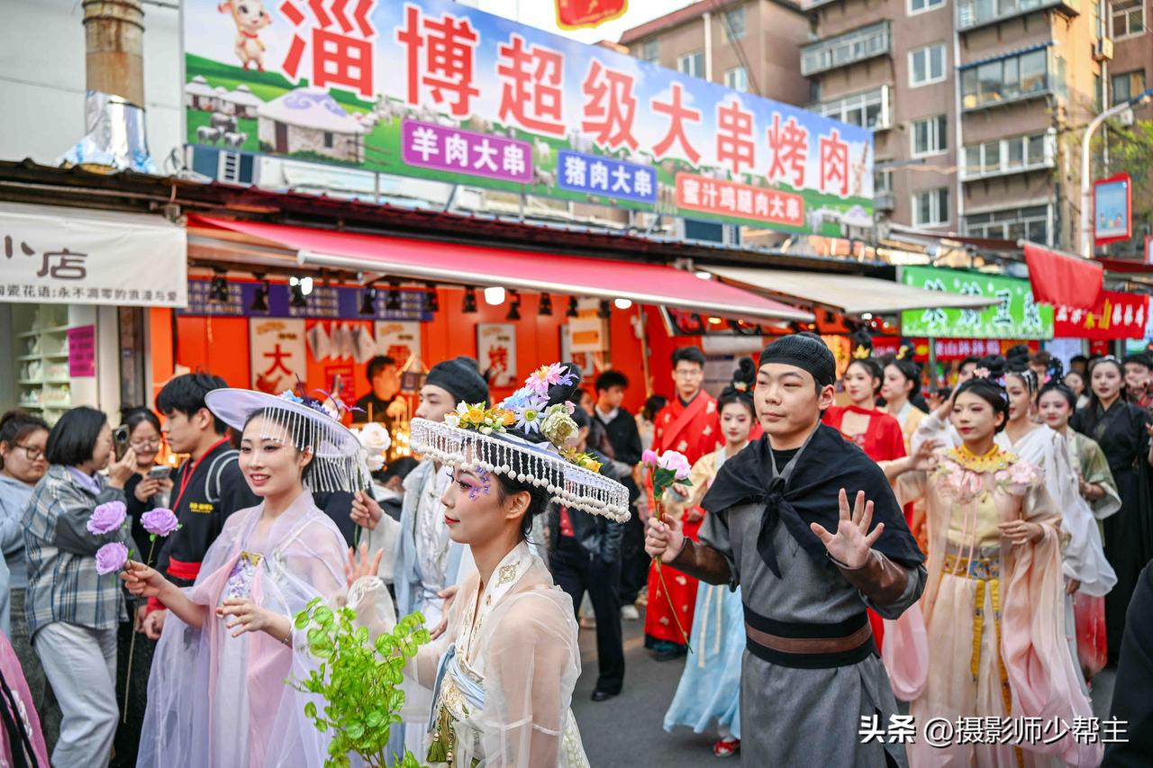 镜头里的宝藏山东淄博也太会整活了!步入八大局便民市场,恰逢街区巡游热闹开场,身着齐文化服饰的演员们踏歌而行,甩袖间绣着的云纹随步伐翻飞,引得往来游客举着手机追拍。插羽毛的大将军、疯狂动物城、拉布布、拳皇等各种热门形象不断亮相,叫卖声、欢笑声与丝竹声交织,红灯笼次第亮起,市井烟火热烈升腾,绘就出一幅独具淄博风情的生活画卷。 相约文旅盛会