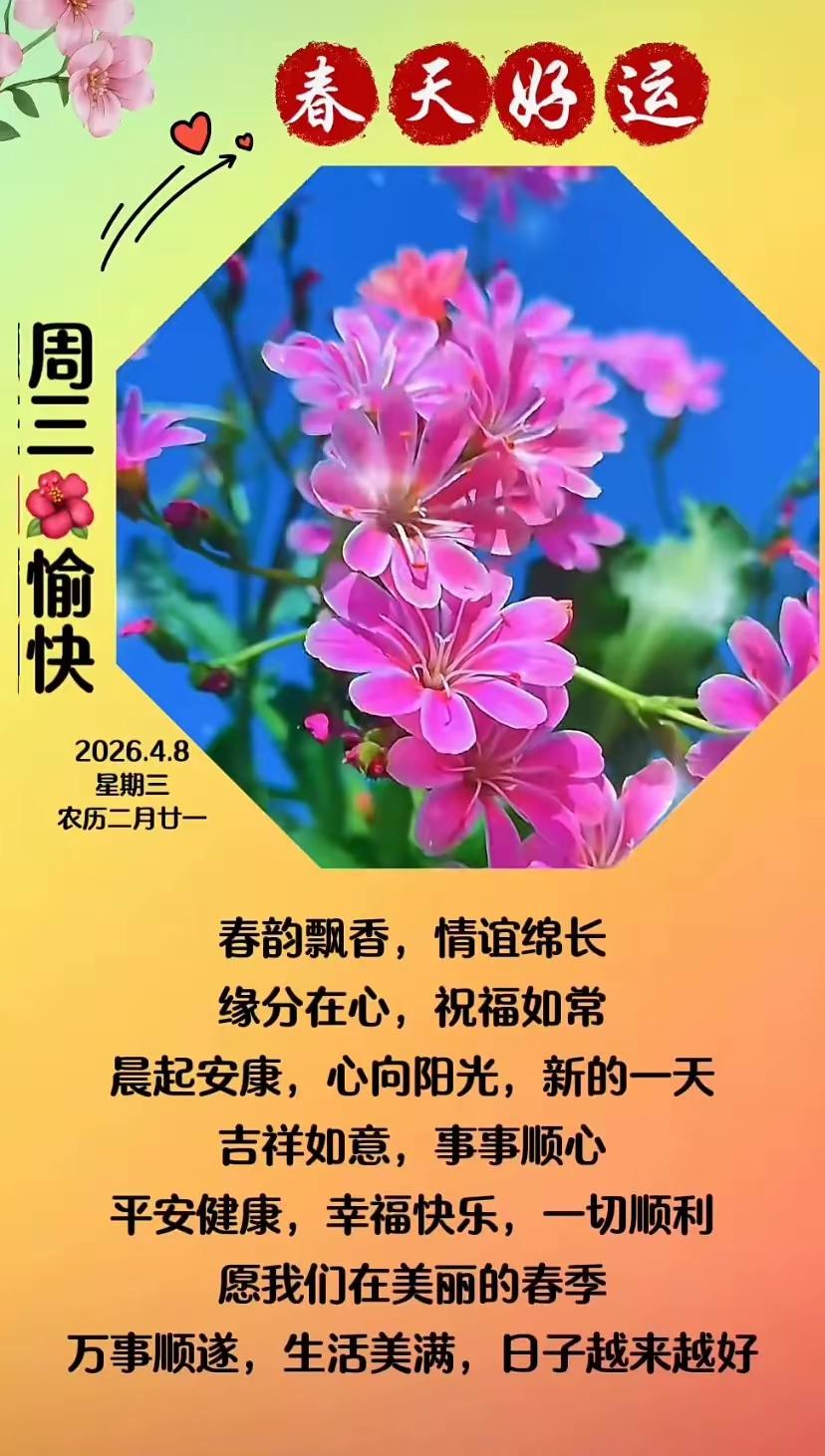 ✨ 早!晨光熹微,好运开场。愿你今天精神满满,工作马到成功,生活喜乐无忧。 把烦恼留在昨天,把希望写进今天,每一步都走得坚定又漂亮。新的一天,一起加油! 特别感谢我的粉丝和友友们的支持,有你们在,每一天都充满力量! 早安正能量 马年行大运