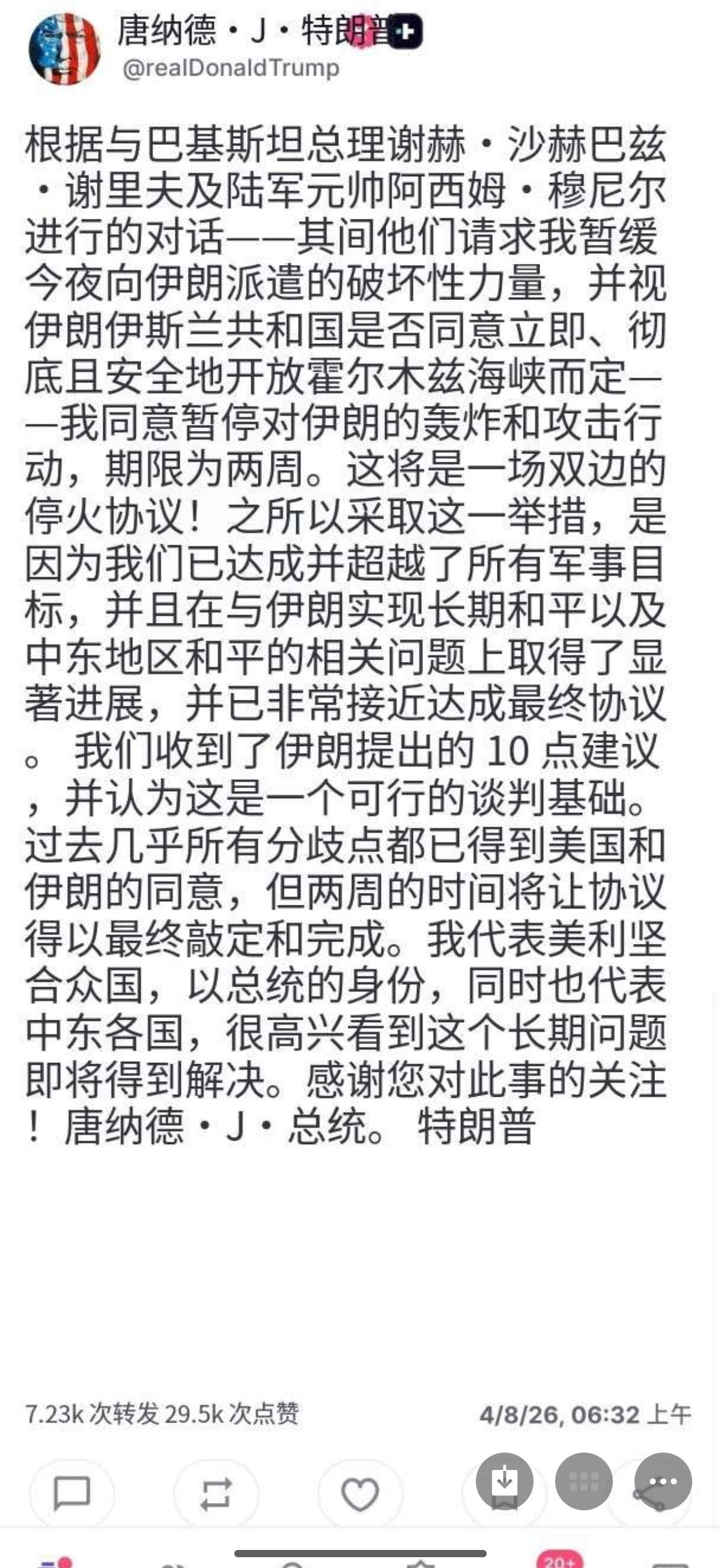 特朗普同意停火2周 原文在这,又又又TACO了?