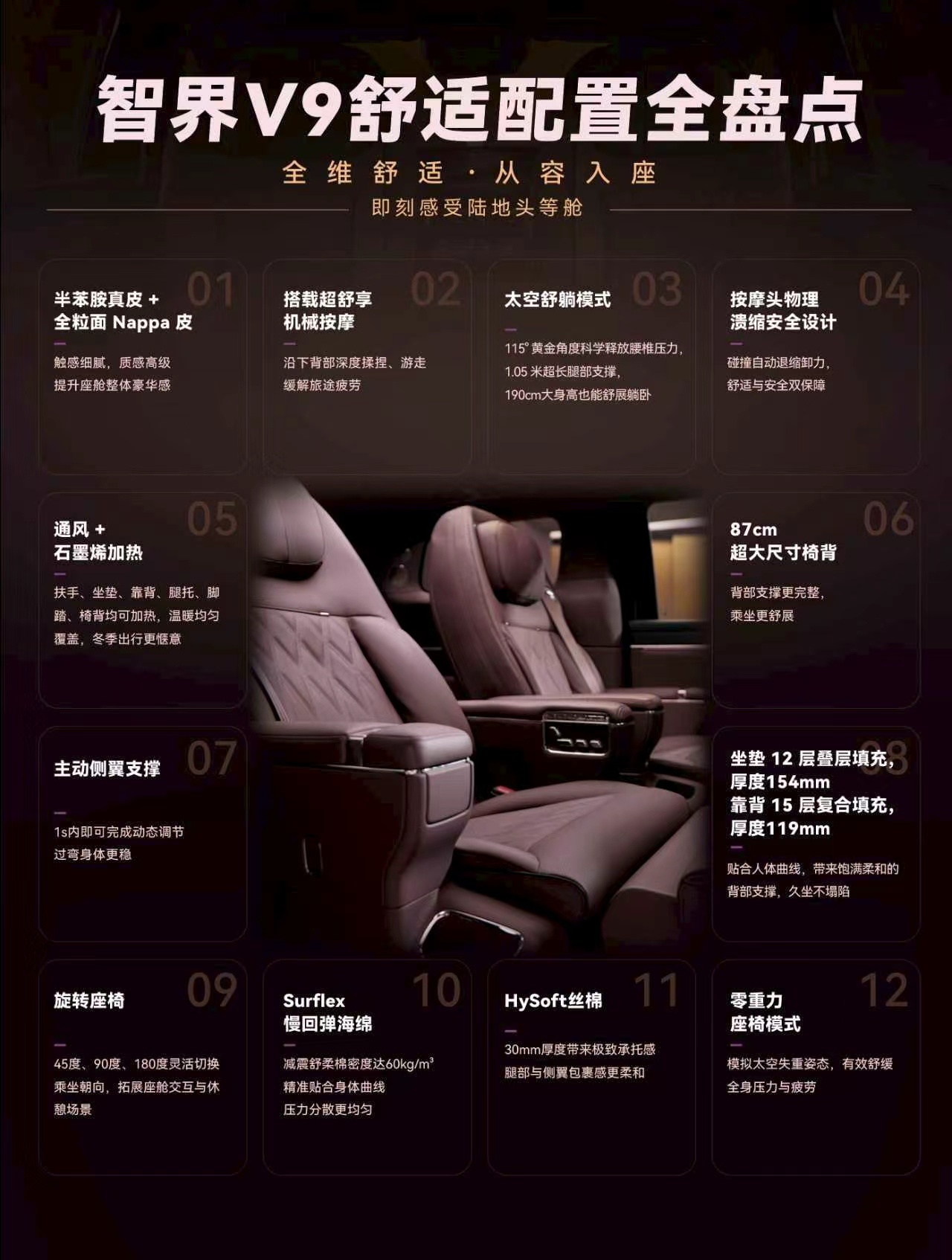 飞机高铁汽车哪个座椅最舒服我有个开MPV的朋友老吐槽,说第二排再舒服,第三排永远是受罪的。但智界V9这个三排数据真让我服气,993毫米头部空间加949毫米腿部空间,配合近一米纯平地板,成年人坐进去双腿能自然伸展。讲真,这才是MPV该有的样子,不是只有老板位舒服,是所有人都舒服。智界V9官宣搭载机械按摩