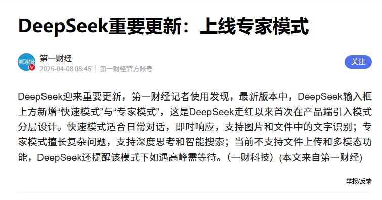 DeepSeek大更新:上线专家模式