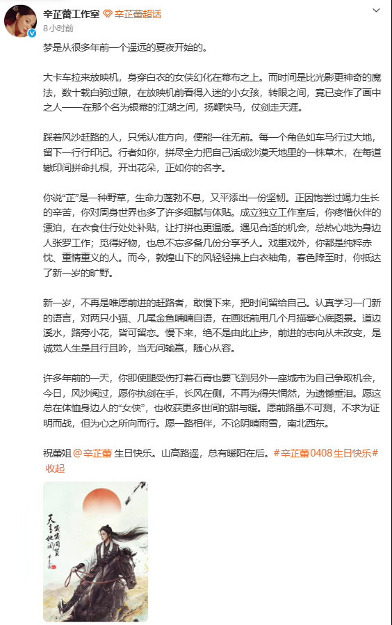辛芷蕾40岁了辛芷蕾生日工作室贺图 辛芷蕾40岁生贺女侠风贺图好绝!白衣快马,天
