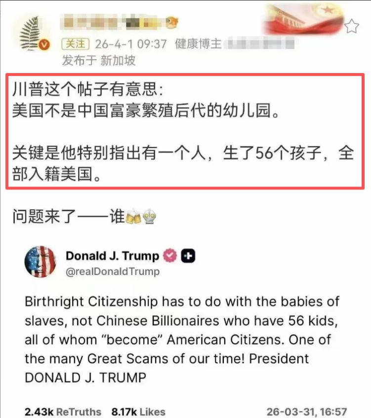 这番言论一出,瞬间引爆舆论场,也让外界把目光聚焦到,美国出生公民权的制度漏洞,与部分富豪跨国生育的灰色操作上。