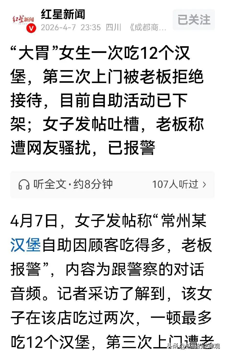 诸位朋友,今儿咱们单说一桩发生在常州街头的“汉堡风云”。这事儿,听着像“江湖恩怨”,实则是一面照妖镜,照出了商家的“小算盘”和食客的“真性情”。一位常州姑娘,天生食量惊人,79块9的自助汉堡,第一次就干了12个,第二次又吃了七八个。结果第三次上门,老板眼珠子都红了,连门都没让她进。这哪是做生意?分明是“玩不起”还硬撑,吃相之难看,简直让人“大跌眼镜”。