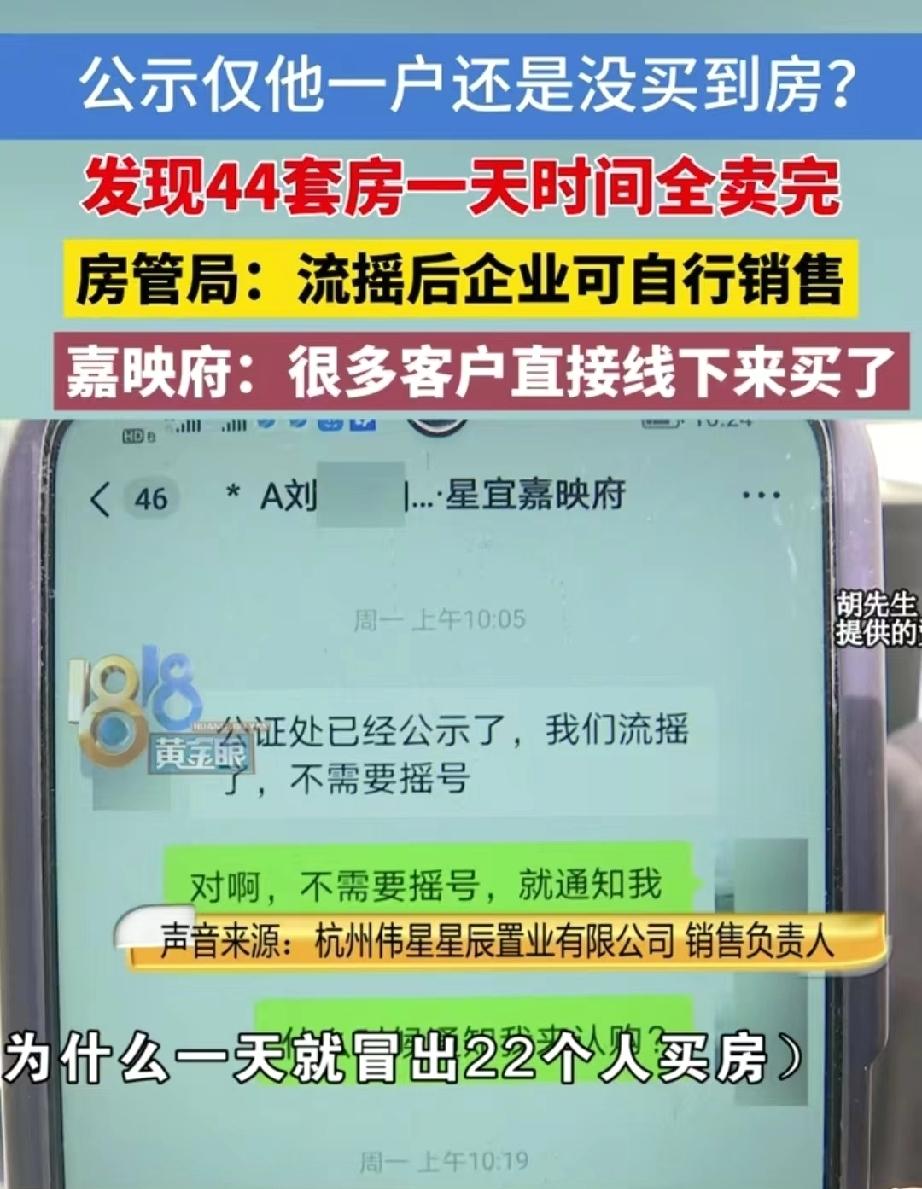 套路太深了!浙江杭州,男子看中了某洋房小区的19幢房子,这幢房子的预售证一公示,他马上准备了资料,报名摇号。第二天公示出来,参加摇号的只有他一个人,男子窃喜,觉得这下稳了。当天,他给销售发消息,对方没有回复,次日他找到售楼部,万万没想到,销售竟说,19幢的44套房源已经全部售罄。男子顿时懵了,明明就他一个报名,一夜之间从哪里冒出来这么多人买房,他怀疑这是开发商的套路。对此,销售人员的解释让他无语。 胡先生一直想换套房子,今年3月份,他看中了城北的一个低密度洋房小区,环境优雅,交通便利,楼盘均价3万6左右。 尤其是刚要加推的19幢,户型和楼层都合他心意,环境挺不错。 而且他还打听到,这幢位置好,房子很可能要涨价,错过了这次,以后说不定要多花好几万。 胡先生一直留意这个楼盘,3月23号,他在网上看到19幢的44套房源拿到了预售证,按照杭州的购房细则,得先报名摇号。 胡先生赶紧忙活起来,3月27号到28号,他跑前跑后准备了各种材料,就完成了报名和审核,心里美滋滋地等着公示。 到了3月30号,开发商的公众号发了个公示,胡先生点开一看,差点没笑出声,本次报名只有他一户。 也就是说,44套房,就他一个人登记,根本不用摇号,直接就能选房。 胡先生心里那个窃喜,就跟中了彩票似的。他早就看中了一套105平方的小户型,总价三百多万,楼层、朝向都研究透了。 这下好了,就他一户,那不是他想挑哪套就哪套,肯定能抢到最心仪的楼层。 公示一出来,他赶紧掏出手机,在微信上问销售,什么时候通知认购?可等了半天,对方一直没回复。 他急得不行,第二天一早就跑到售楼处打听情况。结果工作人员的回答,就像晴天霹雳一样把他劈懵了。 对方说,19幢的房子已经全部卖完了,44套,一套不剩。 胡先生当场就愣住了,都卖完了?昨天公示不才只有他一户报名吗,而且速度再快,一天之内也不可能把44套全卖完吧! 但工作人员明确表示,他们内部通过自行销售,已经全部售罄。 胡先生当时就炸了,自己花了那么多时间准备报名、打征信报告,就等着选房,结果你们一声不吭就把房子卖完了? 这么大的房产公司,难道不讲究诚信经营吗? 他找到售楼处经理讨说法,经理却说不清楚情况,调查清楚后会尽快回复。 胡先生不甘心,又去问了当地房管局。 工作人员解释:按照规定,如果登记人数没达到房源数,就叫“流摇”。公证处会出一份流摇公证书,有了这个公证书,开发商就可以自己卖房子了。 关键是看认购的时间点和公证书出来的时间点哪个在前。 房管局查了一下,3月30号公证处确实出了公证书,而胡先生是31号才到售楼处,那时候房子已经卖完了。 可胡先生更纳闷了,就算能自己卖,一天之内就卖光44套?这也太邪门了。 开发商回应称,19幢这次有105平和130平两种户型,各占一半,105平的小户型是头一次拿出来卖,其实很多客户之前就感兴趣,但他们懒得参加摇号登记,就想着等流摇之后直接线下买。 所以,3月31号那天,一下子来了22个人,把22套小户型全买走了,大户型也陆续有人买,一天之内真的就清盘了。 那胡先生30号在微信上问销售,为什么没人通知他? 销售负责人后来也承认,可能当时客户量比较大,销售漏看了消息,也没再打电话追问,这一点他们回头再核实。 言下之意,要是销售及时回复了,胡先生兴许还能抢到一套。 可胡先生还是越想越觉得不对劲,既然你们早就有那么多意向客户,干嘛不让人家登记,非要等流摇之后再偷偷卖? 他怀疑开发商根本就是故意不通知他,好把房子留给关系户或者等着涨价。 这么大的房产公司,竟然毫无诚信,忙活了半天,到头来竹篮打水一场空,胡先生心里别提有多憋屈了。 《民法典》第五百零九条规定∶当事人应当遵循诚信原则,根据合同的性质、目的和交易习惯履行通知、协助、保密等义务。 胡先生完成购房登记并通过审核,与开发商已形成商品房预售的预约合同关系。 开发商在楼盘“流摇”后转为自行销售,依法负有主动、及时通知唯一登记人胡先生的法定义务 。 但开发商不仅未主动告知销售时间,还在胡先生微信询问时未予回复,直接导致其错失认购机会,明显违反诚信原则与法定通知义务。 虽杭州政策允许流摇后自行销售,但该权利行使不能损害已登记购房者的合法权益,开发商以“漏看消息”为由推卸责任,在法律上不成立。 胡先生为购房投入时间、精力准备材料,却因开发商过错导致购房目的落空,所以,他有权主张赔偿损失。