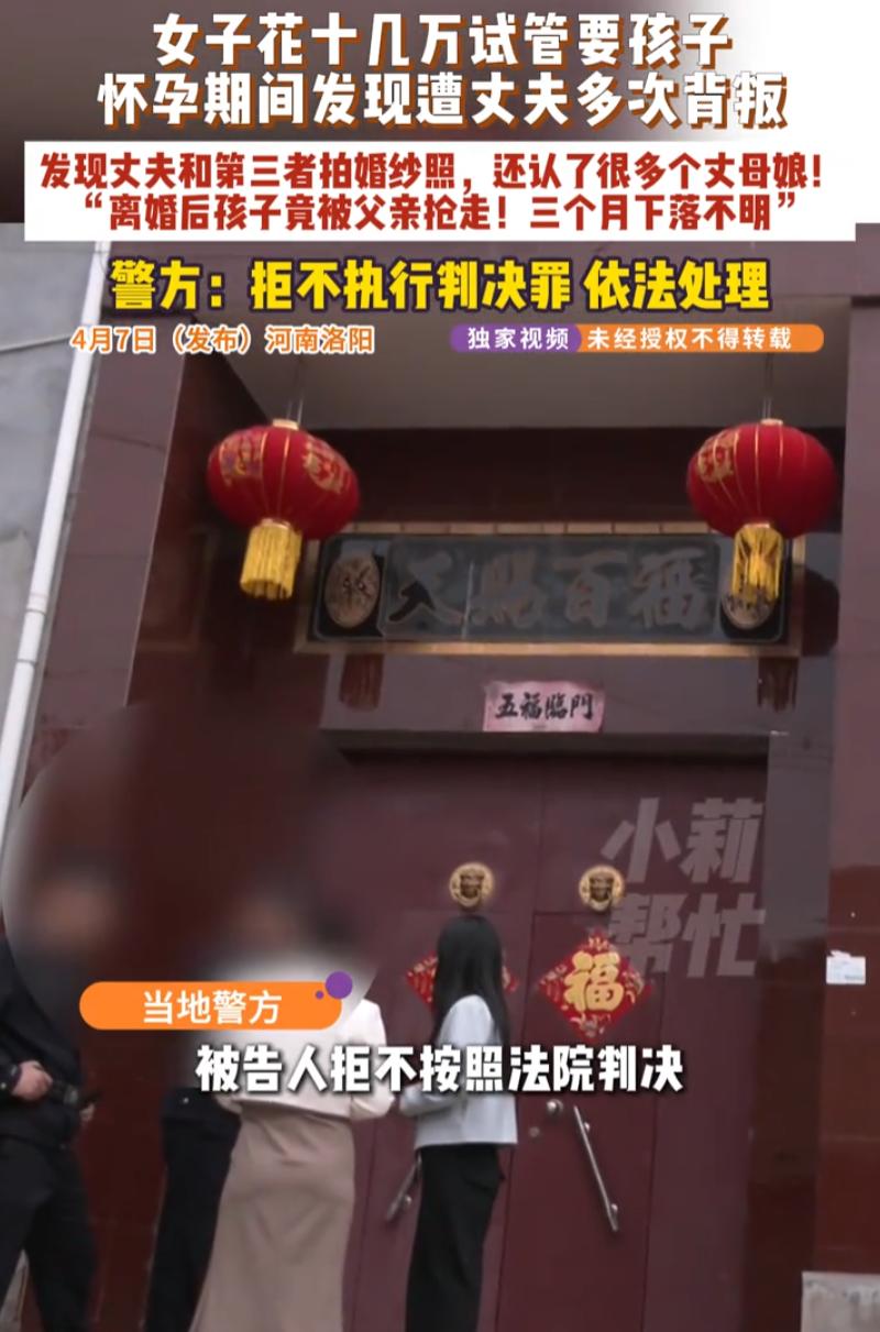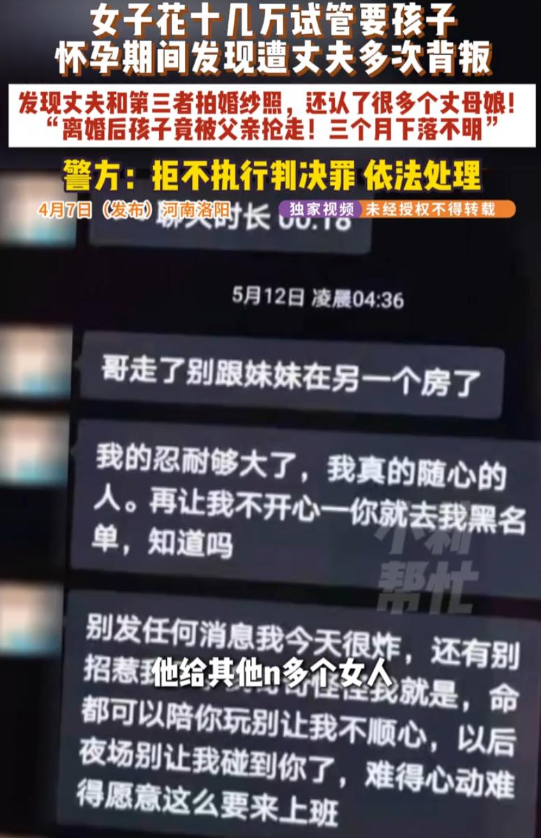 河南洛阳,女子为了怀孕生子,花了十几万做试管,扎了500多针,可后面却得知,丈夫在她怀孕期间背着她出轨了20个女人,甚至连婚纱照都拍了,女子忍无可忍选择离婚,可前公公婆婆却把孩子给抢走,女子只能选择报警