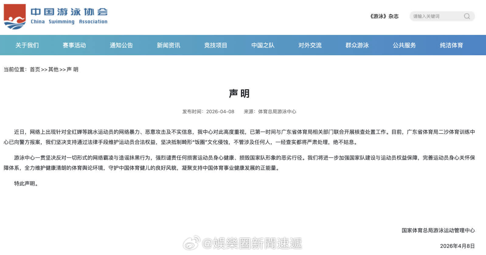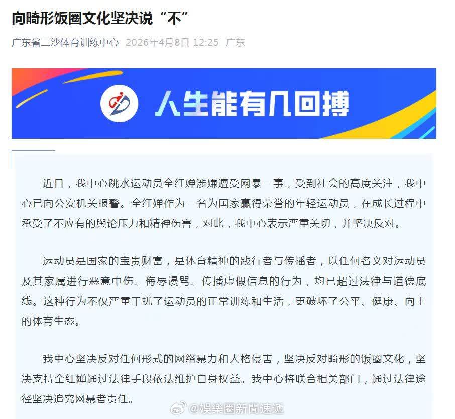 二沙訓練中心:已向公安機關報案 追究網暴者法律責任作為全紅嬋所屬的訓練單位,廣東省二沙體育訓練中心今日透過官方微信公眾號表示,全紅嬋涉嫌遭受網暴一事已引起社會高度關注,中心已向公安機關報案,將透過法律途徑堅決追究相關人員責任。二沙中心在聲明中指出,全紅嬋作為為國家贏得榮譽的年輕運動員,在成長過程中承受了不應有的輿論壓力和精神傷害。中心認為,任何以個人或家屬為對象的惡意中傷、侮辱謾罵及傳播虛假資訊行為,均已逾越法律與道德底線,嚴重干擾運動員的訓練與生活。