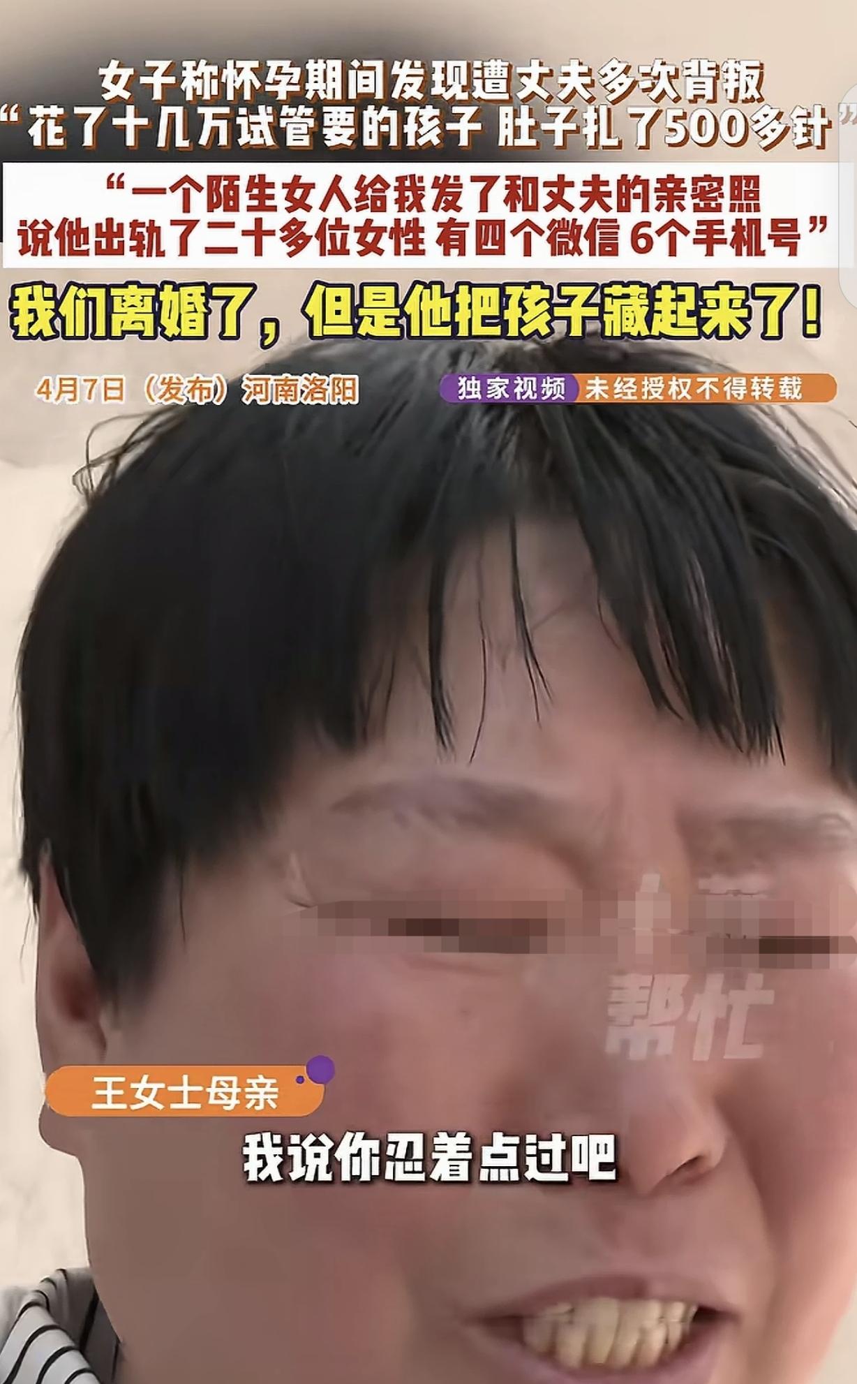 “玩的太花了!”河南,女子再婚一年,花了10几万做试管,肚子扎了500多针,好不容易怀孕,可刚怀上,就有个女人加她微信,把她和丈夫各种不雅视频照片疯狂发给她,她这才知道,丈夫和20多个女人有肮脏关系,有4个微信号,6个手机号。母亲劝她,都二婚了,忍着点吧,谁家的经都不好念。女子忍无可忍离了婚,可前夫竟然把孩子藏起来了。 河南的王女士怎么也没想到,自己掏心掏肺、赌上命去经营的这段二婚,到头来竟然是一场精心设计的骗局。 为了能给这个家留个后,她不仅搭进去十几万块钱,还在肚子上扎了500多针去做试管,结果换来的却是丈夫的无耻背叛,甚至连死里逃生生下的孩子都被对方强行抢走了。 王女士以前有过一段不如意的婚姻,2020年通过相亲认识了现在的丈夫,当时她想,既然是二婚,就得加倍珍惜,好好跟人家过日子。 可结婚一年多,她的肚子始终没动静,为了能有个共同的孩子让家庭更稳固,王女士一咬牙,决定去做试管婴儿。 没经历过试管的人,根本想象不出那种罪,前前后后十几万的开销不说,最难熬的是那密密麻麻的排卵针。 王女士每天都要往肚皮上扎针,旧的针眼还没结痂,新的针头又扎了进去,整块肚皮青紫交加,没一处好地方,整整500多针啊,她就这么硬生生地挺了过来,忍着恶心、失眠和浮肿,总算盼到了怀孕的那一天。 就在她满心欢喜准备当妈妈的时候,一个陌生女人的微信,像个炸弹一样把她的幸福炸成了碎片。 那个女人通过好友申请后,二话不说就发来了一堆照片和视频,里面全都是王女士丈夫和各种女性不堪入目的亲密画面。 对方告诉王女士,她那个看起来老实的丈夫,背地里简直就是个“海王”,他身上揣着6个手机号,开了4个微信号,专门用来勾搭不同的女人。 据统计,跟他保持不正当关系的女性竟然有20多个。更荒唐的是,他不仅跟别的女人拍了婚纱照,还认了好几个“丈母娘”。 王女士当时感觉天旋地转,浑身冷得发抖,她怎么也想不通,自己在那儿拼了半条命生孩子,枕边人竟然在外面过着这种糜烂的日子。 她哭着回娘家求助,可母亲看着她离过一次婚,只能叹着气劝她:“二婚不容易,能忍就忍忍吧,为了肚子里的孩子,凑合过得了。” 王女士也想过为了孩子凑合,可看着那些铁证,她实在咽不下这口气,这哪是过日子,这分明是把自己当成了生育机器和傻子,孩子出生后,她彻底冷了心,果断把这个男人告上法庭要求离婚。 法院判得很清楚,两人离婚,孩子归王女士抚养,前夫得按月给抚养费,王女士以为这下总算解脱了,能带着孩子安稳生活了,谁知道前夫一家人更绝。 2026年1月初,孩子正在放学的路上,前夫带着他的父母突然冲了出来,几个人不由分说,当着王女士的面,硬是把孩子从她怀里抢走,然后一头钻进车里消失了,打那以后,前夫一家就像人间蒸发了一样,电话不接,敲门不应,亲戚也都说不知道。 到现在三个月过去了,王女士整天以泪洗面,人都快疯了,那是她花了十几万、挨了500多针、拿命换来的孩子啊!她找遍了能找的地方,可始终见不到孩子一面,不知道孩子吃得好不好,有没有哭着找妈妈。 这件事曝光后,大伙都气坏了,谁能想到一个二婚女人想求份安稳,竟然遇到了这么一个披着人皮的狼。 目前,当地的警方和村委会都已经管这事了,律师也说了,前夫这种当街抢孩子、拒不执行法院判决的行为已经违法了,搞不好还得坐牢。 可对于王女士来说,惩罚恶人固然重要,但她现在心心念念的只有孩子,好好的一段婚姻,最后变成了一场让人心寒的骗局;费尽千辛万苦生的宝贝,被这家人无情夺走。 王女士的遭遇提醒了所有人:婚姻里的真心千万得看准了人再给,遇到这种没底线的背叛和伤害,一味忍让只会让对方变本加厉,关键时刻必须得靠法律保护好自己和孩子。 现在,大家只希望王女士能快点找回孩子,让这对苦命的母子早日团聚。 对此你怎么看? 信源:云潮新闻