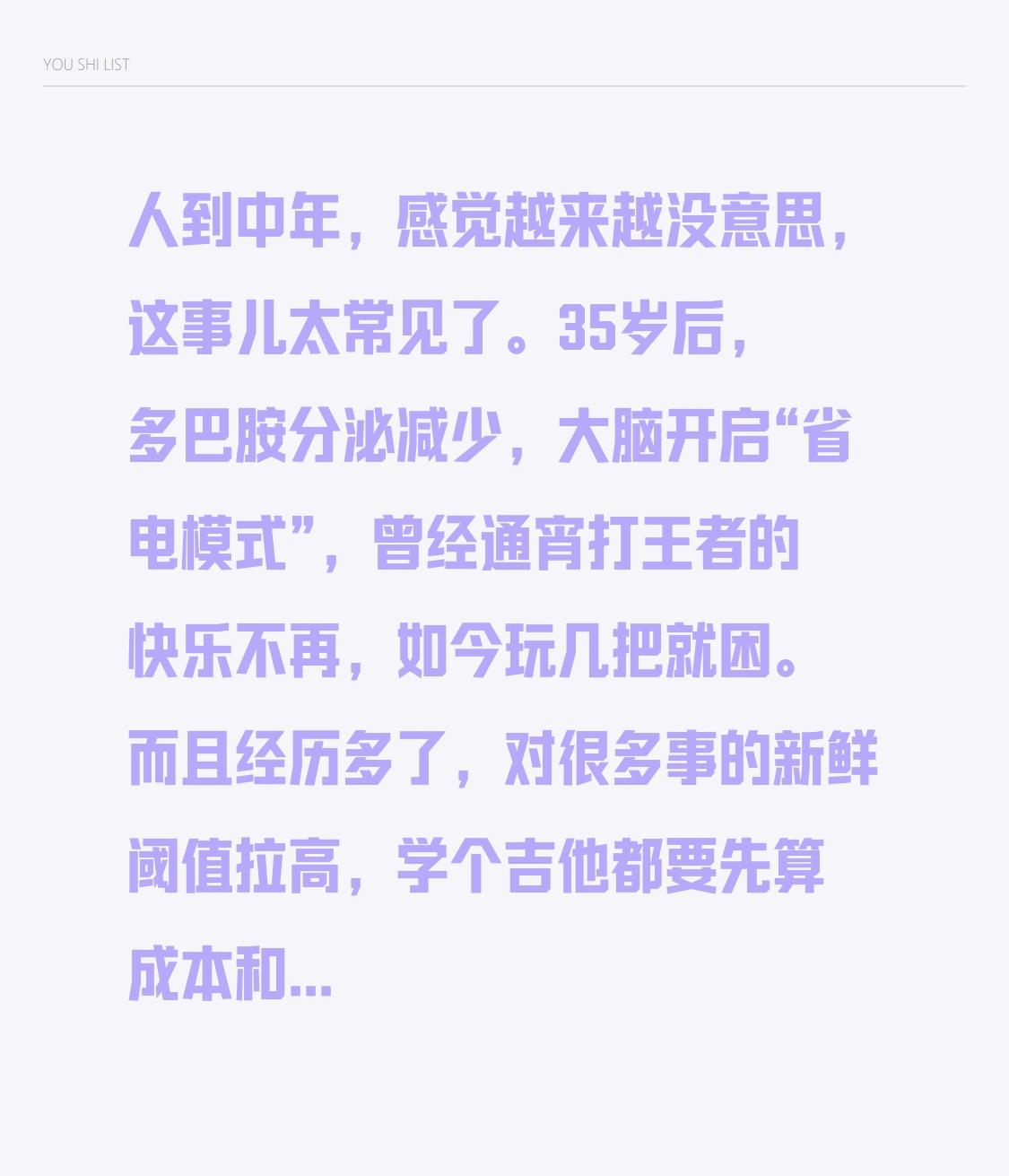 人到中年,感觉越来越没意思,这事儿太常见了。35岁后,多巴胺分泌减少,大脑开启“省电模式”,曾经通宵打王者的快乐不再,如今玩几把就困。而且经历多了,对很多事的新鲜阈值拉高,学个吉他都要先算成本和时间,兴趣一下就没了。