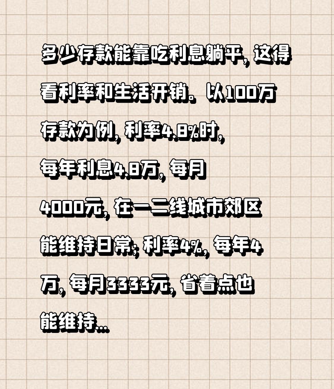 多少存款能靠吃利息躺平,这得看利率和生活开销。以100万存款为例,利率4.8%时