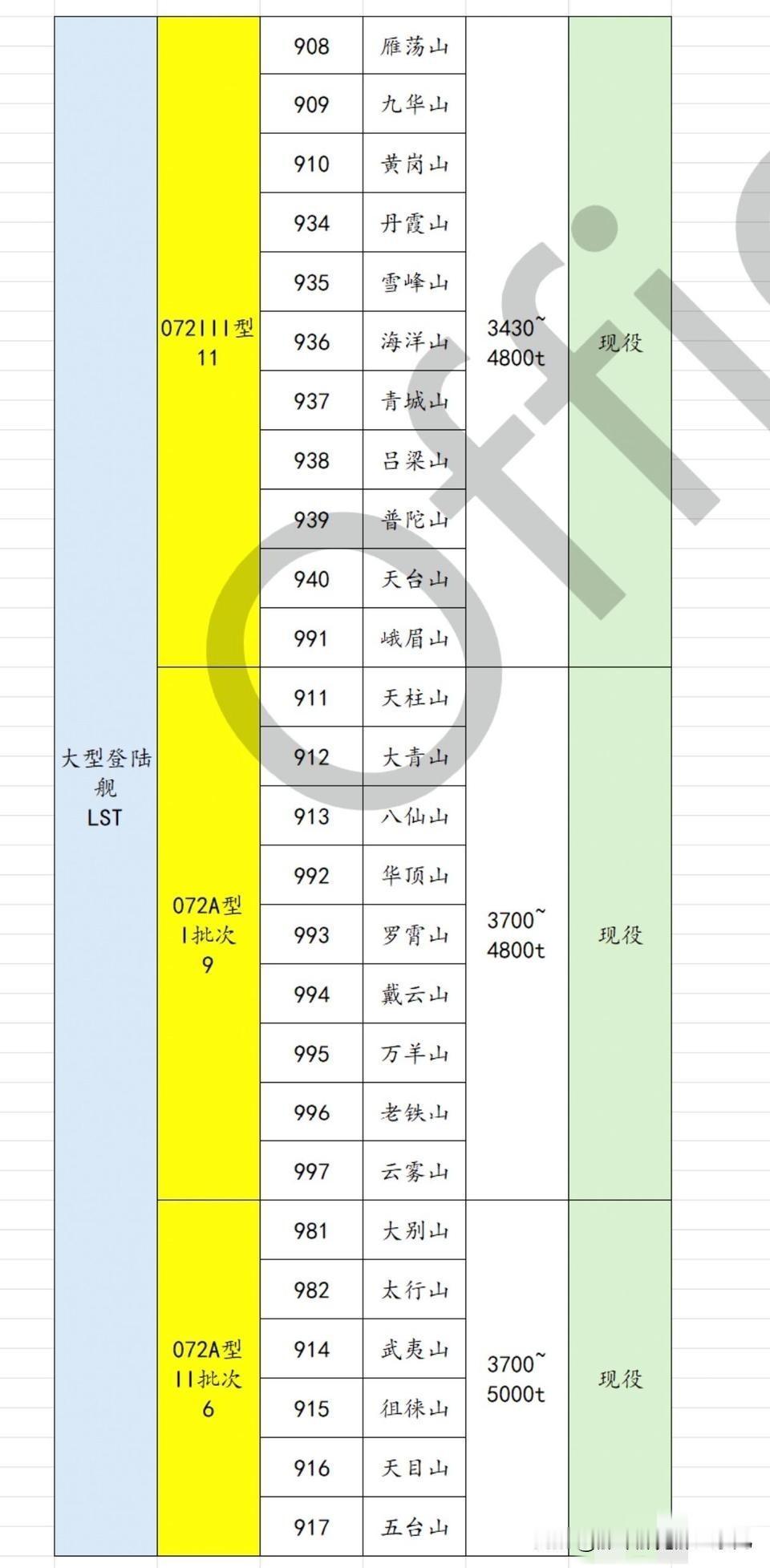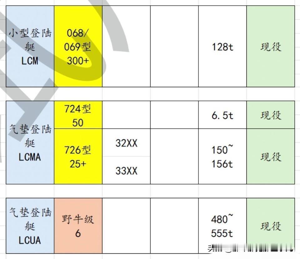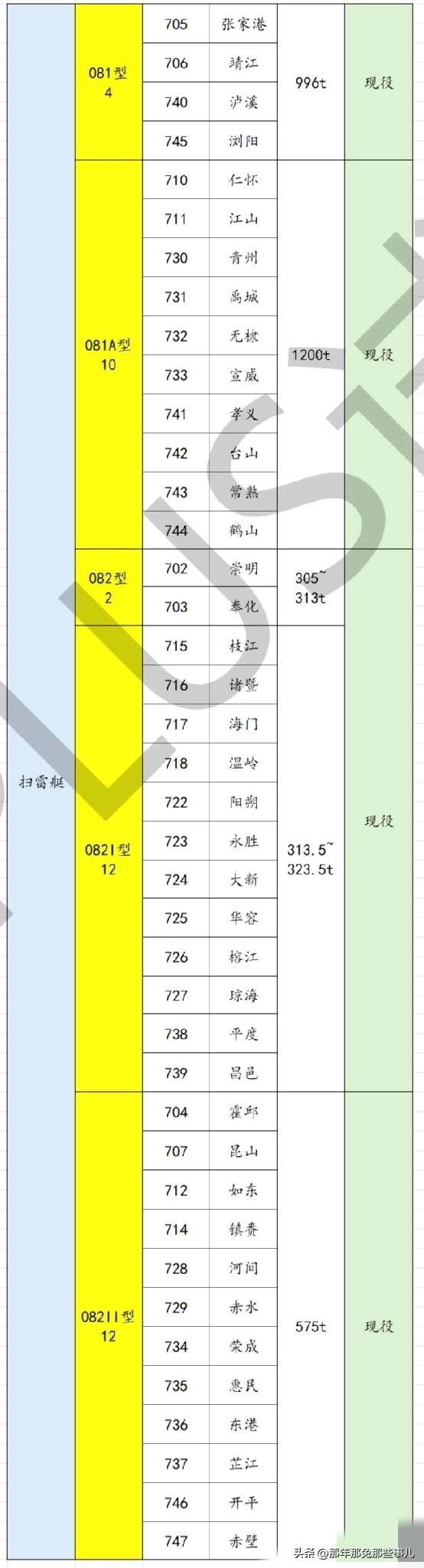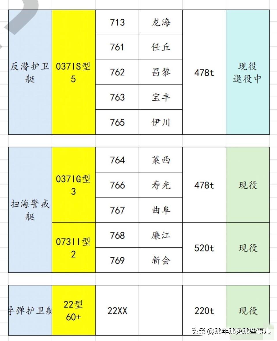 所有的表格都这样,从左往右,舰艇类别→型号→舷号→舰/艇名→排水量→目前状态(截止2026.4.1)