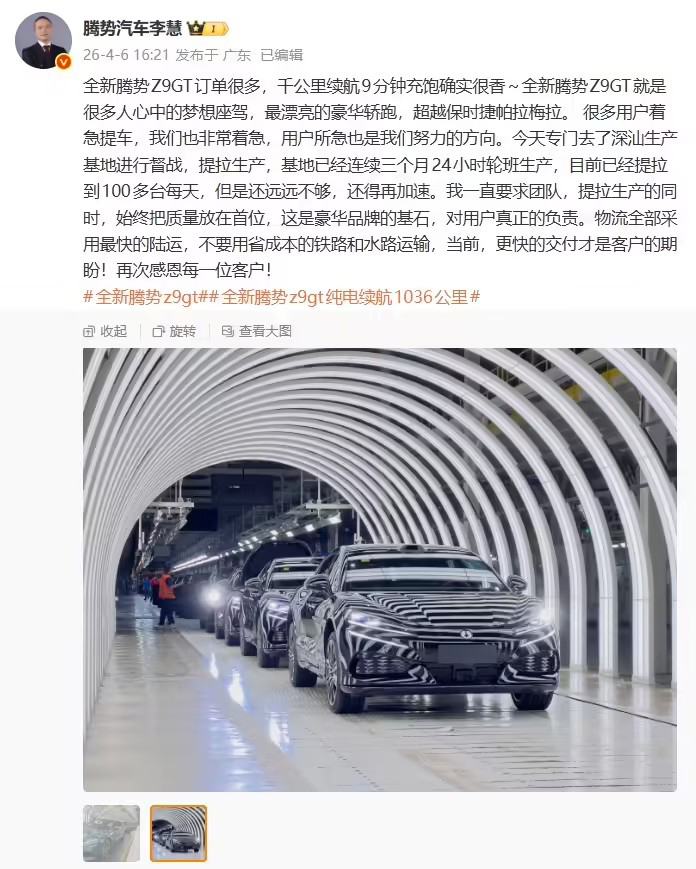 首先,订单火爆远超预期,产能跟不上需求增速。李慧在微博中透露,Z9GT在手订单达几万台,日均新增订单曾稳定在300台以上,而日产能100多台,即便不新增订单,消化现有订单也需要很长时间,这是产能显得紧张的核心原因之一。