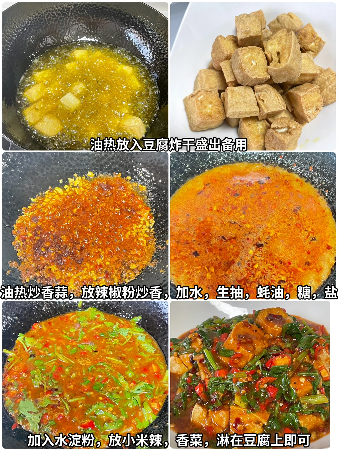 锅里少留一点底油炒香,提前准备好的蒜末,然后放入辣椒粉和孜然粉炒香,加入水,放入适量的生抽、蚝油、糖、盐、鸡精熬开再加入。一碗水淀粉熬制浓稠,放入小米辣和香菜。淋在炸好的豆腐上即可。