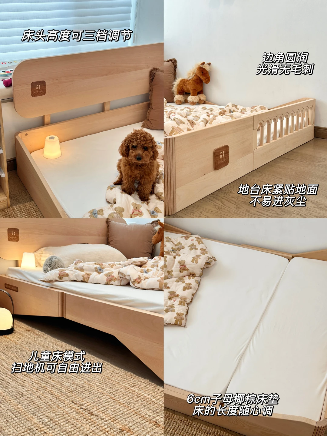地台床模式贴地超安全,13cm高度上下很轻松,四面都有挡板围着~孩子半夜随便翻身都很放心~等孩子大一点把地台床一翻转,就是标准的儿童床模式了,床底高度也足够扫地机器人轻松进出,没有卫生死角干干净净的。