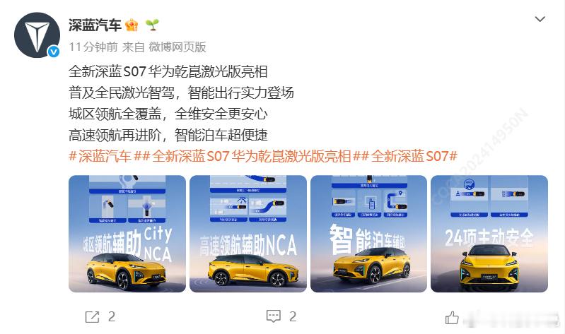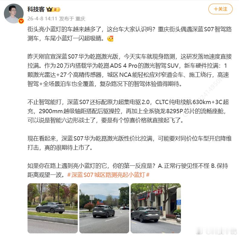 深蓝S07城区路测亮起小蓝灯深蓝S07华为乾崑激光版已在重庆正式开启实车路测,测试画面曝光,车身标志性小蓝灯清晰亮起,实锤搭载华为乾崑激光视觉方案,上市进程全面提速。