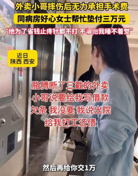看哭了!2025年3月陕西西安,女子在母亲的病房,看到同病房的外卖小哥,胳膊断了三节,手术费大概5万元,为了省钱,他竟然跟医生说不打止痛做手术,后来他又打电话给家人和亲戚借钱,可只借到15,000元,他很无助,如果15天之内不动手术,他的手就废了,女子看到了,心里很不是滋味,就帮他交了3万元,事后她母亲还说:你一定要给他留下钱,女子又给他留了1000元的伙食费,女子说:如果我不帮他,我会睡不着觉的。