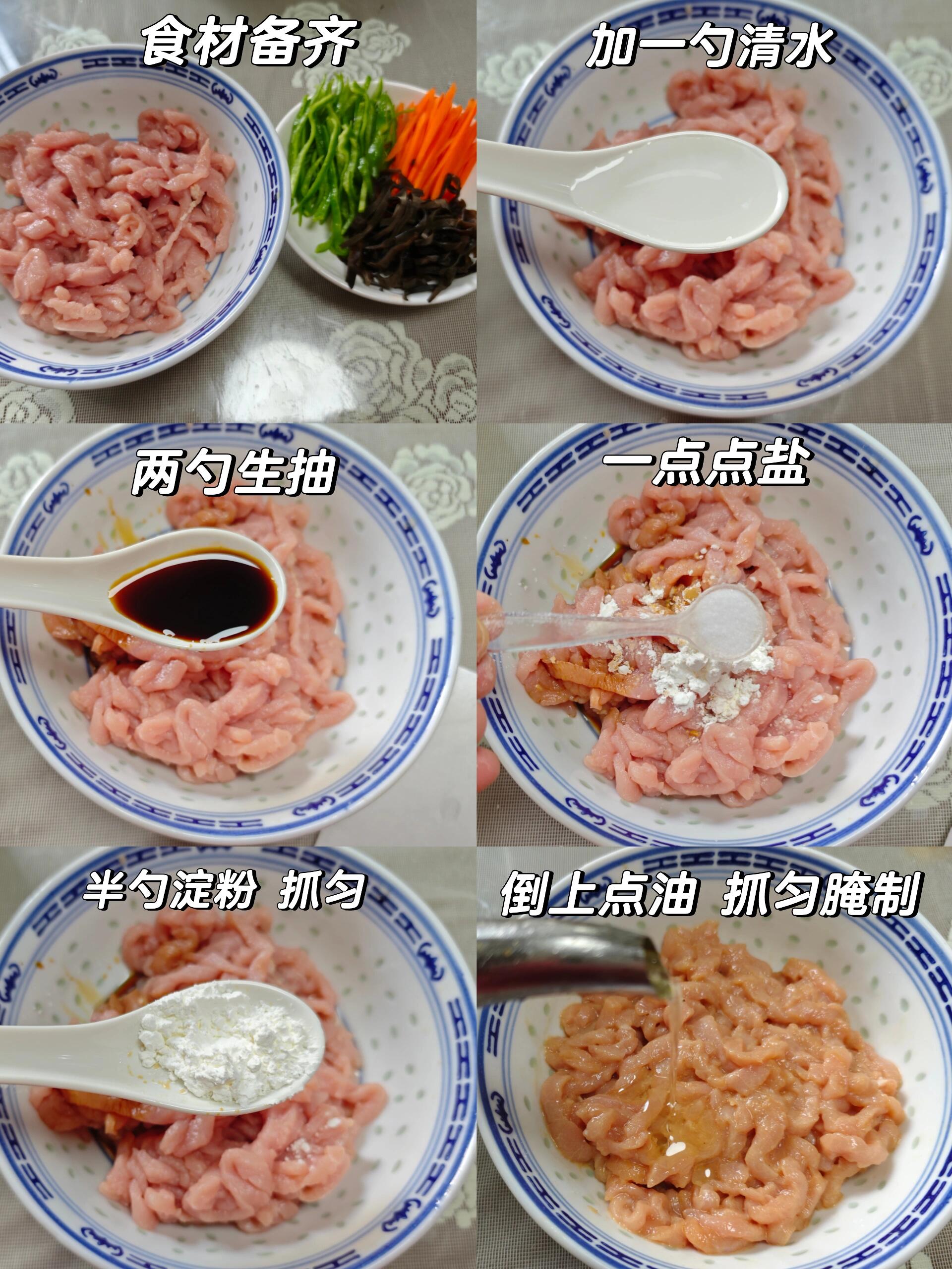 1️⃣ 先处理肉丝:猪肉切成细丝,加一勺清水、两勺生抽、一点点盐、半勺淀粉,用手抓匀上浆,最后淋上少许食用油,再次抓匀,腌制10分钟(这样腌出来的肉丝,滑嫩不柴,还不粘在一起)