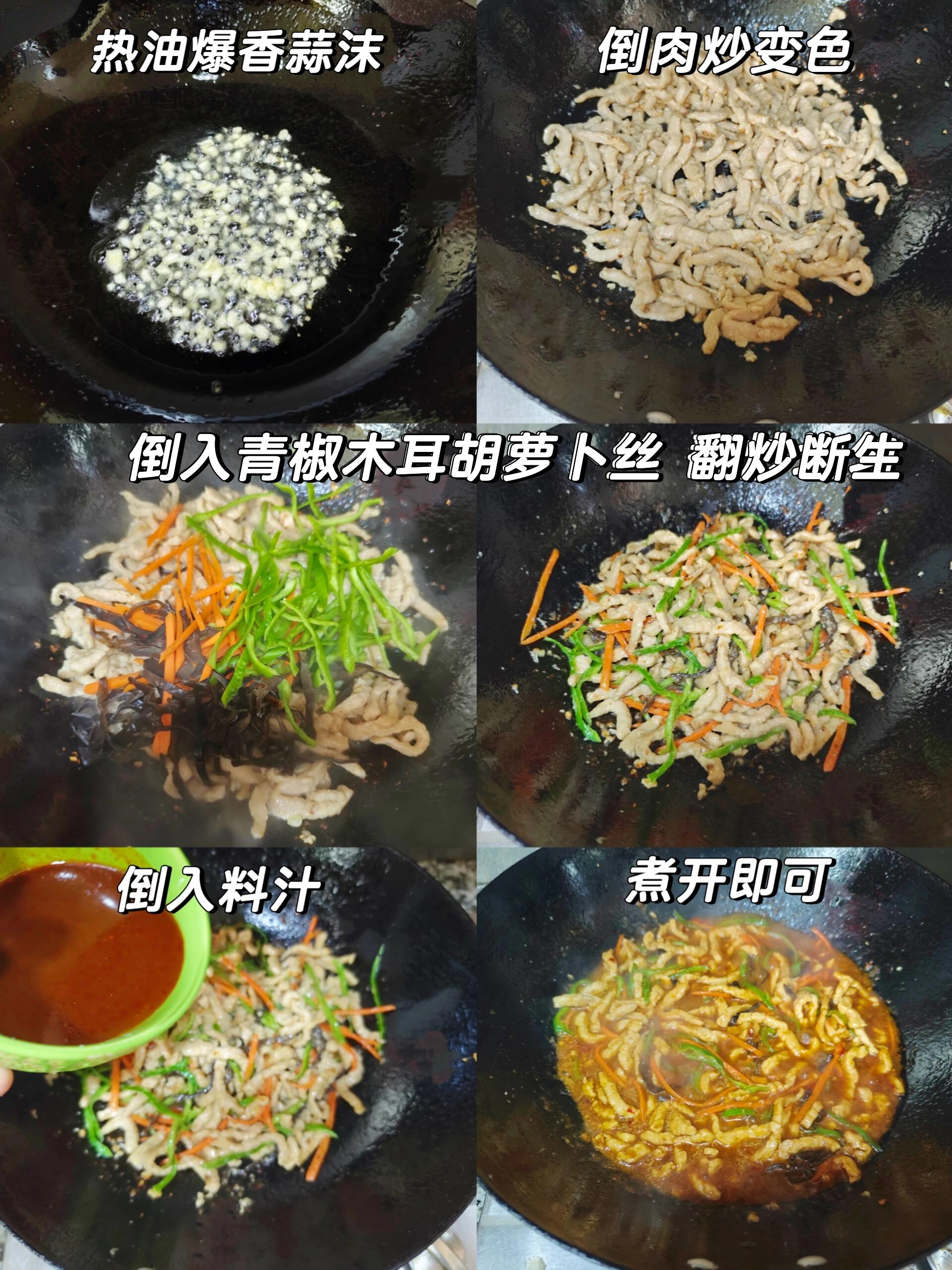 3️⃣ 起锅烧油,油热后放入蒜末,小火爆香,接着倒入腌制好的肉丝,大火快速翻炒,直到肉丝变色断生,然后加入切好的青椒丝、胡萝卜丝、木耳丝,继续翻炒至食材断生