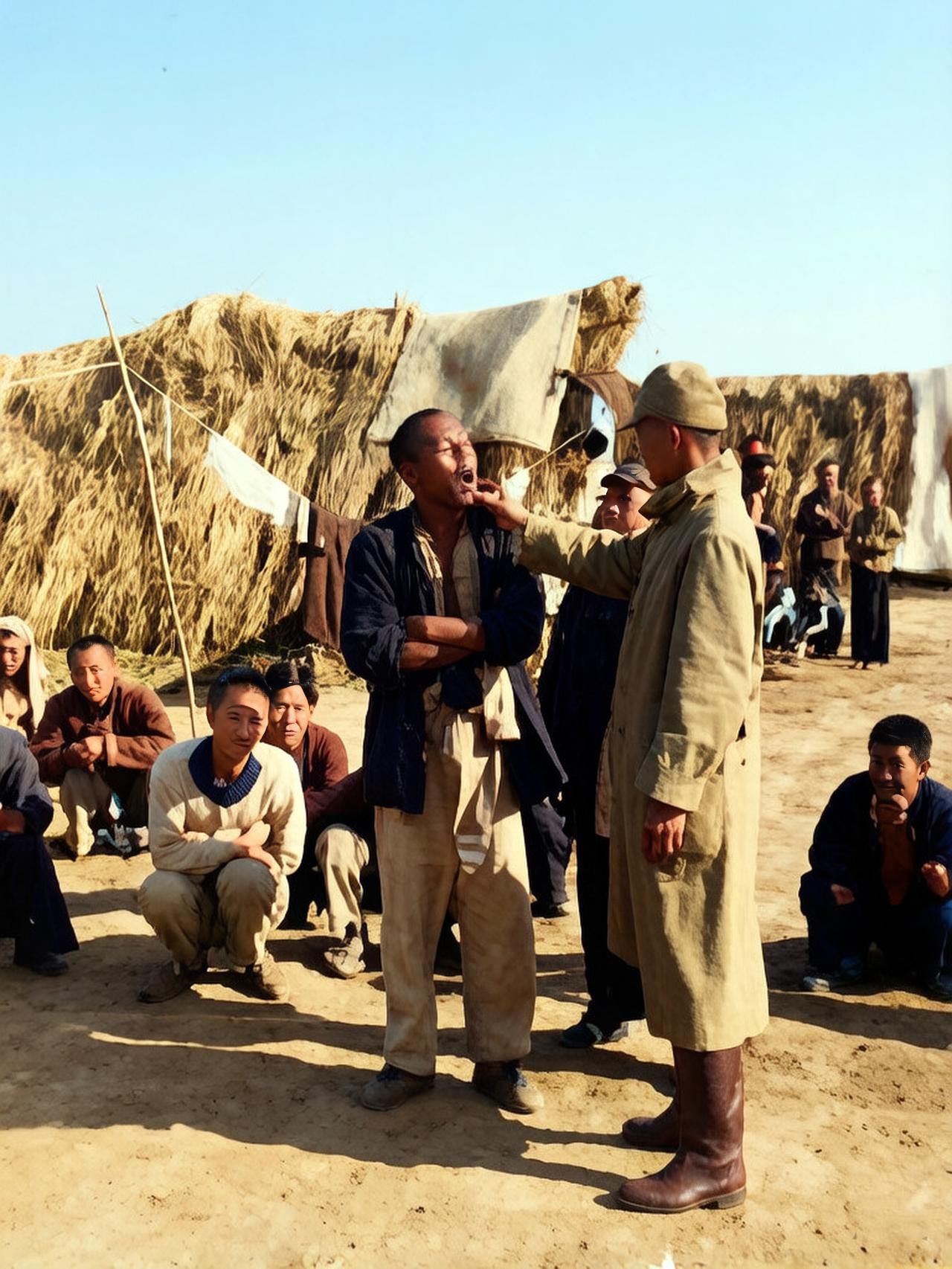 南京沦陷之后,一名日本军人正在难民区内搜捕可能混入的中国军人,检查的方法极其简单,通过被检查者的牙齿颜色来判断,牙齿白的人通常会被断定为军人,因为军人在队伍中会被要求刷牙。