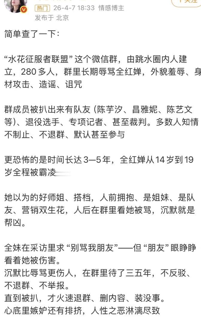 太佩服香港媒体了,有事是真上,公开网暴全红婵的微信群组织,成员282人,更令人震惊的是群内竟然有一些是跳水界的业内人士,那么他们肯定和全红婵认识,在群内虽然不吭声,但面对对全红婵毫无底线的谩骂也就意味着他们默认这些黑粉的行为,婵宝干干净净,拼搏努力靠自己的成绩获得世界荣誉,到底是挡了谁的路,这么黑她!