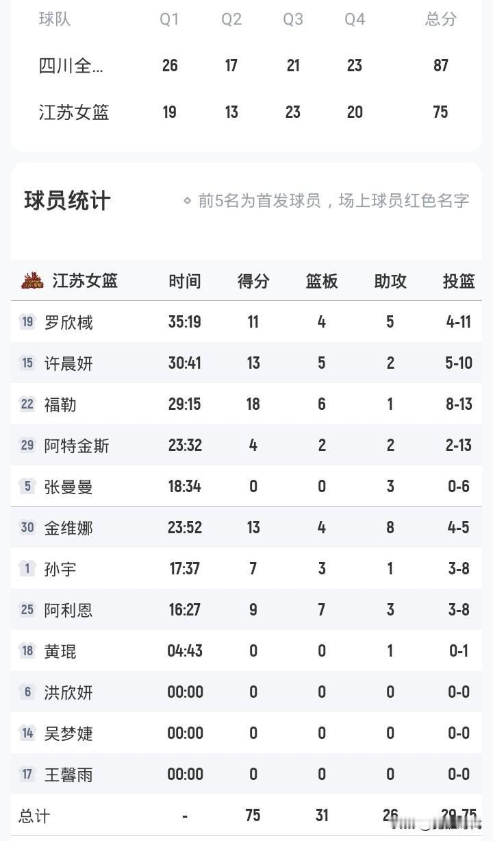 李缘17+9助 高颂8+6助 四川女篮87-75江苏 罗欣棫11+5 金维娜13