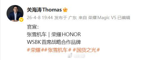 荣耀真的越来越让我喜欢了最近这几次的发布会就很不一样,刚刚看关总微博官宣跨界联手我只想说真正的强者,从来都是同频共振!荣耀跟张雪机车配一脸好吧荣耀张雪机车战略合作