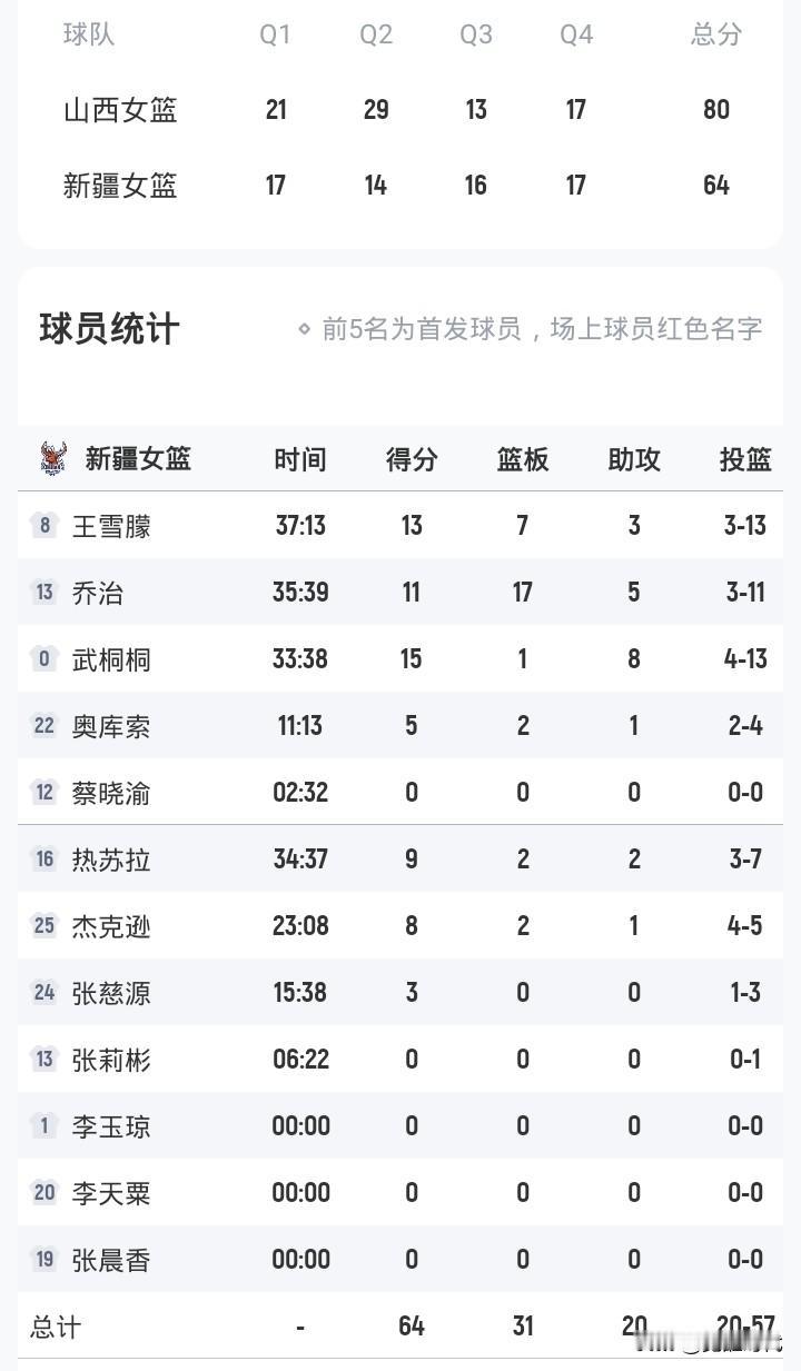 宋珂欣17+6 陈玉婕9分 山西女篮80-64新疆 武桐桐15+8 王雪朦13+