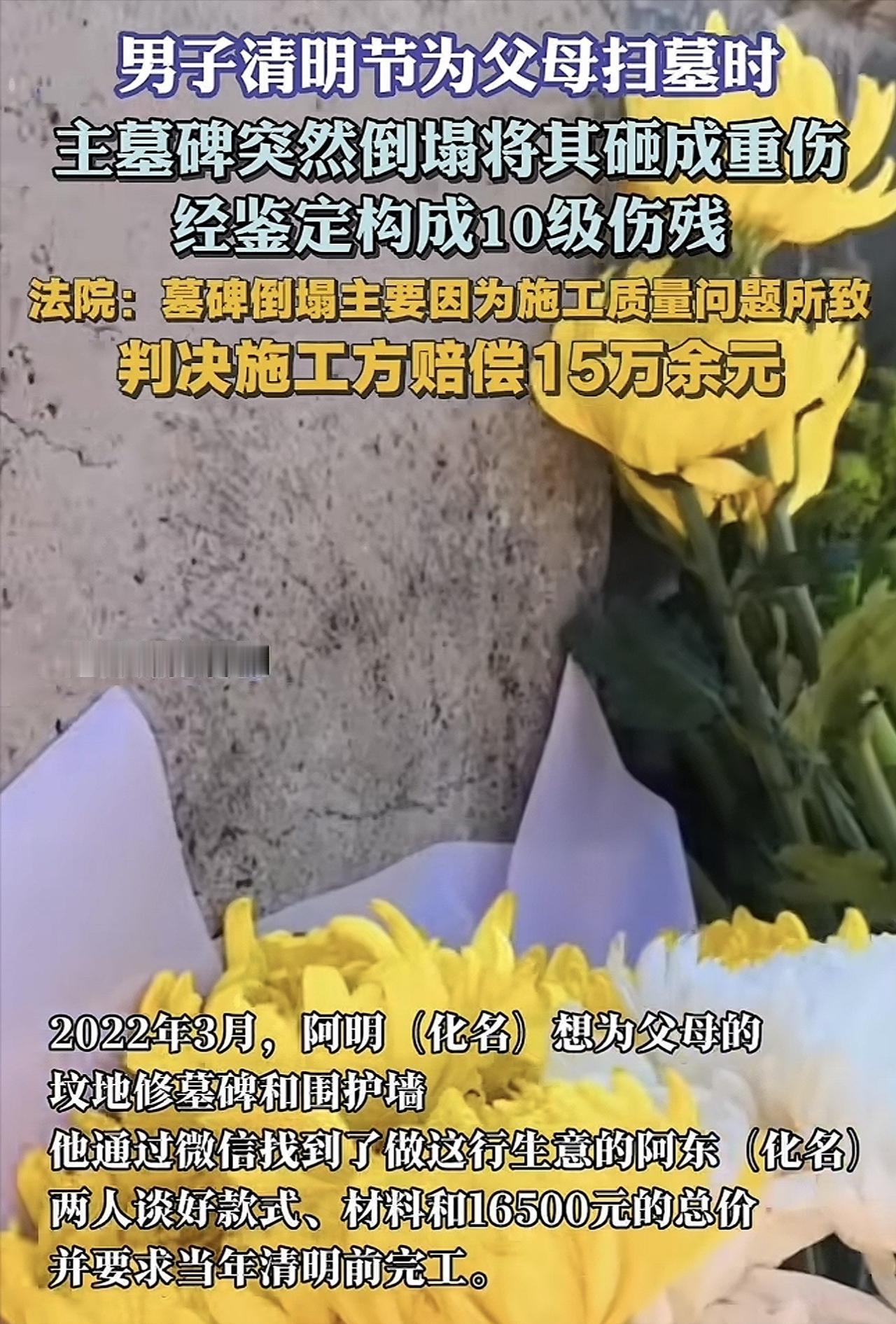 “祖宗显灵?”湖南,一男子花16500元,为父母立了块墓碑,岂料,2年后的清明节,男子去上坟时,墓碑突然倒下来,竟将男子砸成重伤,造成10级伤残,住院花了22万,事后,男子找施工方索赔,对方却一口拒绝,而法院这样判!