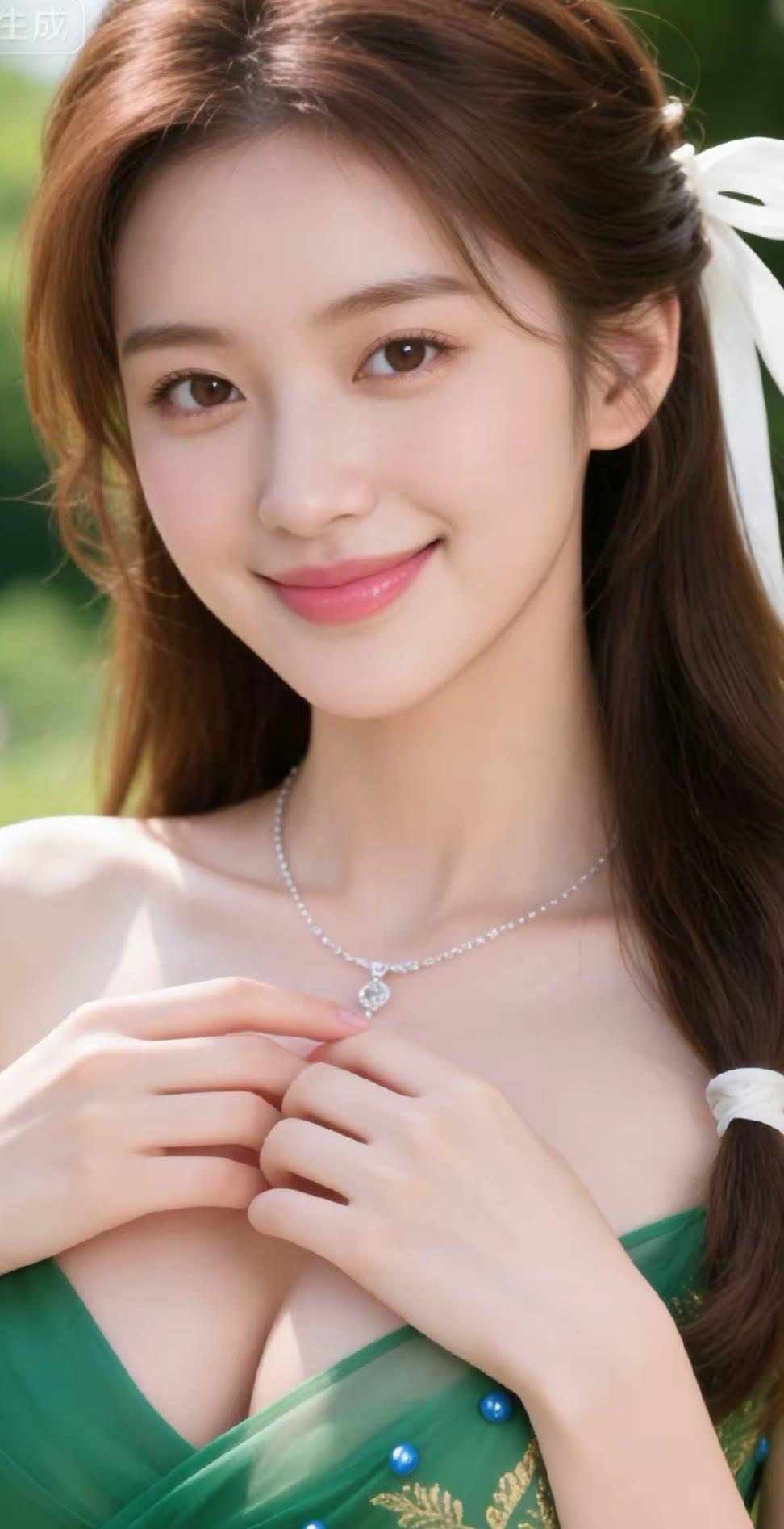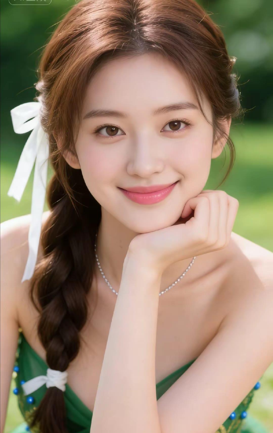 夏日清新少女,绿意盎然背景,甜美笑容,自然妆容,优雅发型,清新自然,少女心满满。