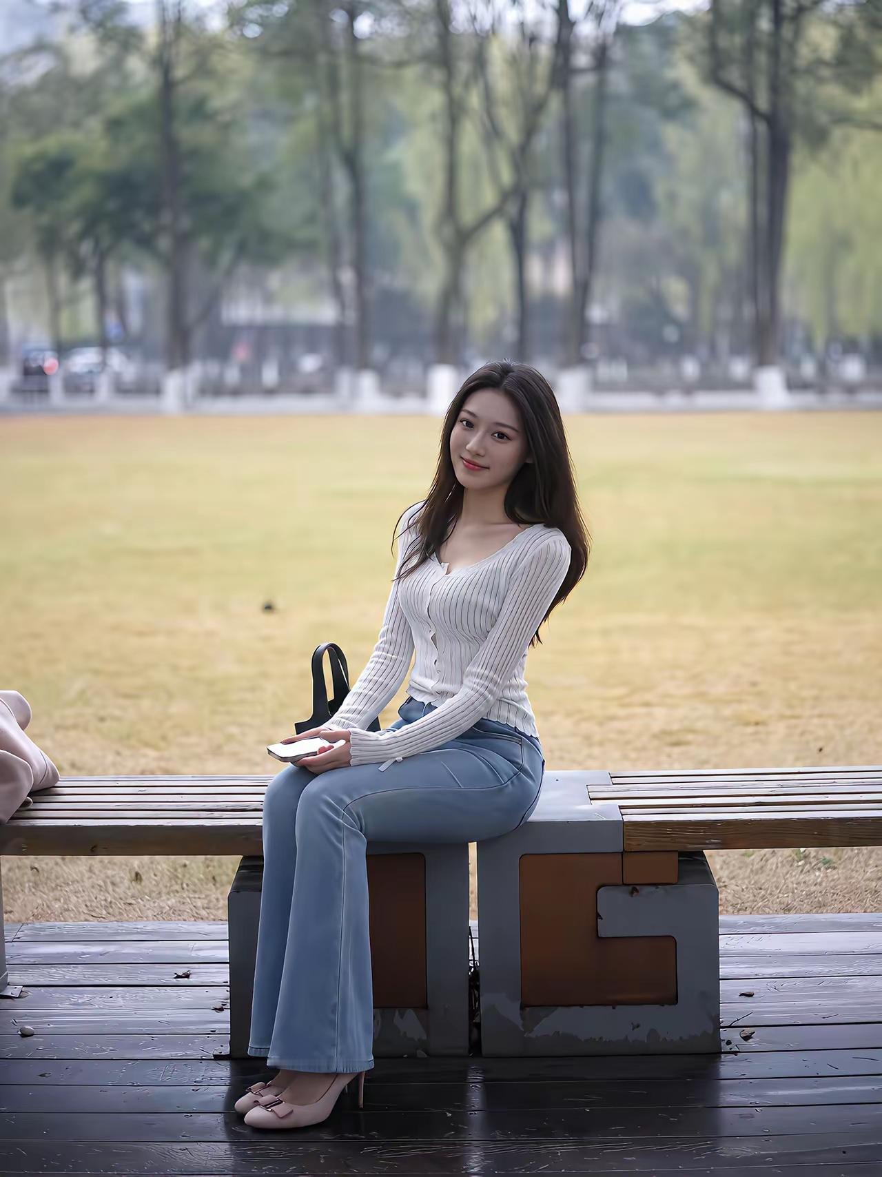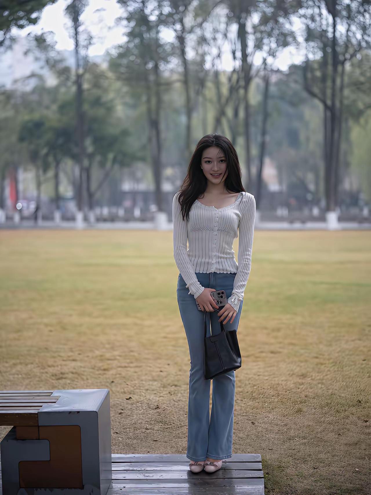 白针织衫衬得眉眼愈发清甜,牛仔裤勾勒出舒展的线条,随性又亮眼。她提着黑包,踩着软鞋,笑意浅浅,把牛仔裤的自在与青春,穿成了独属于自己的风景。