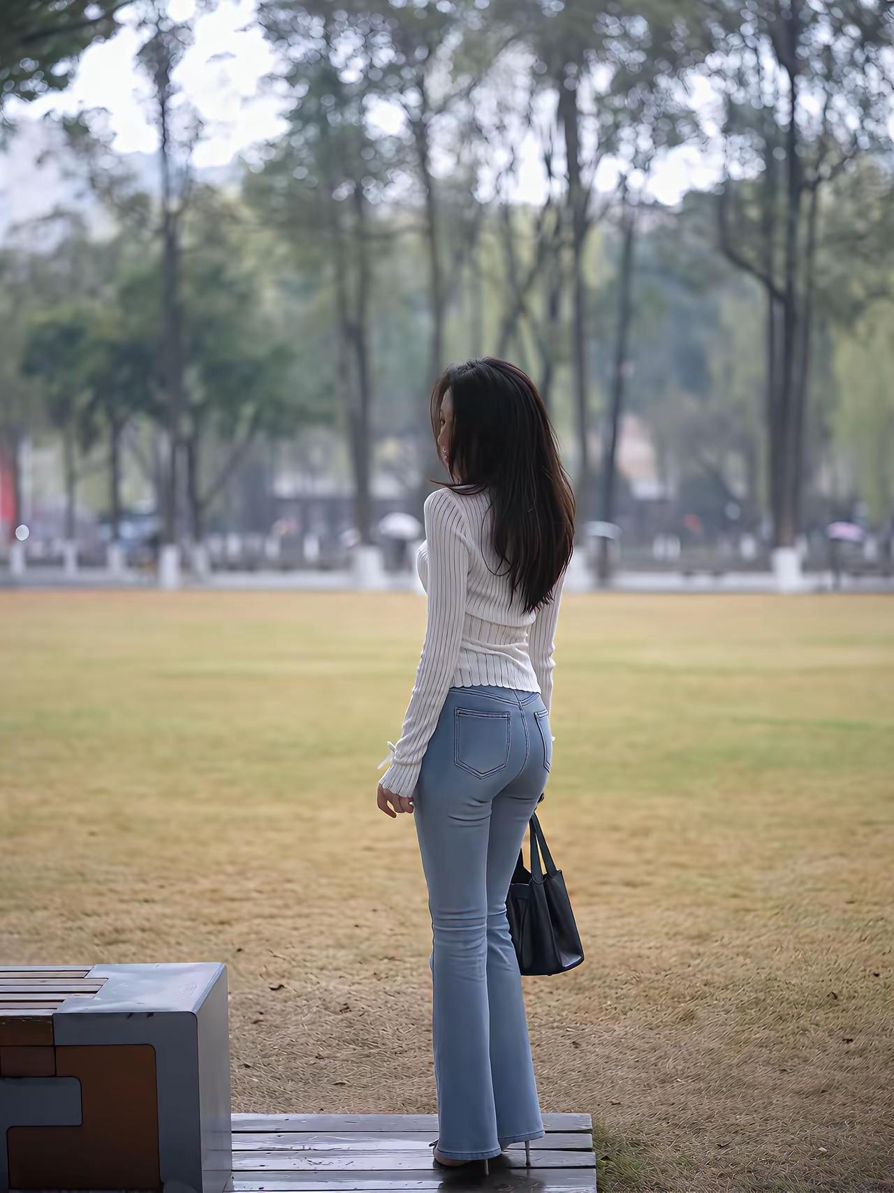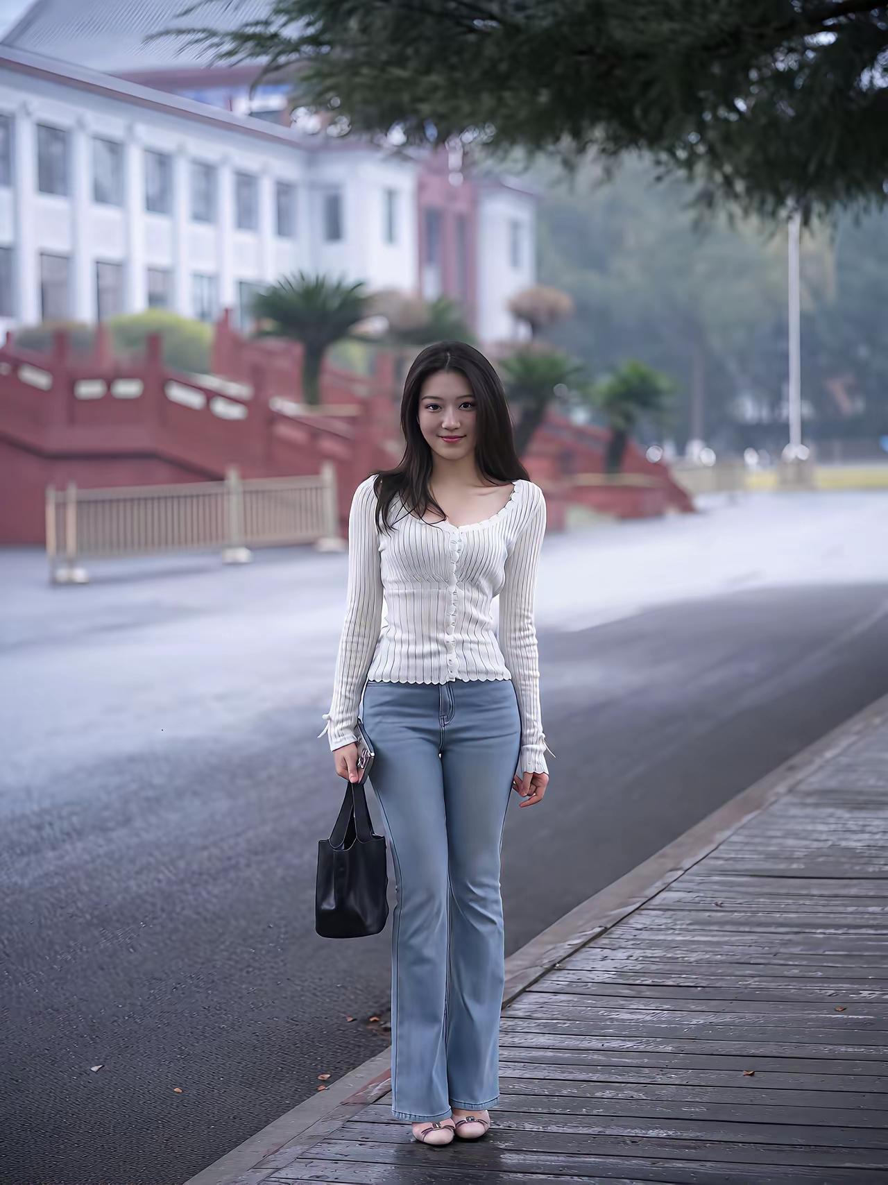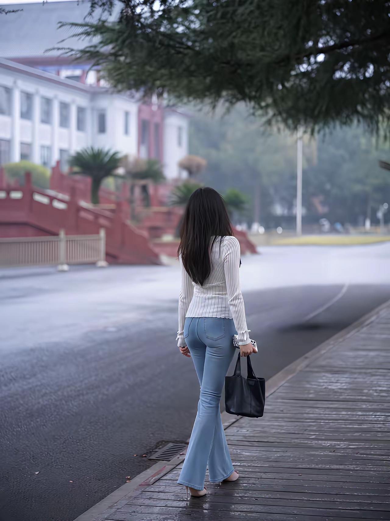 雨后的石板路泛着清润的光,她就站在那里,一身浅蓝色喇叭牛仔裤,把利落与温柔揉得刚刚好。