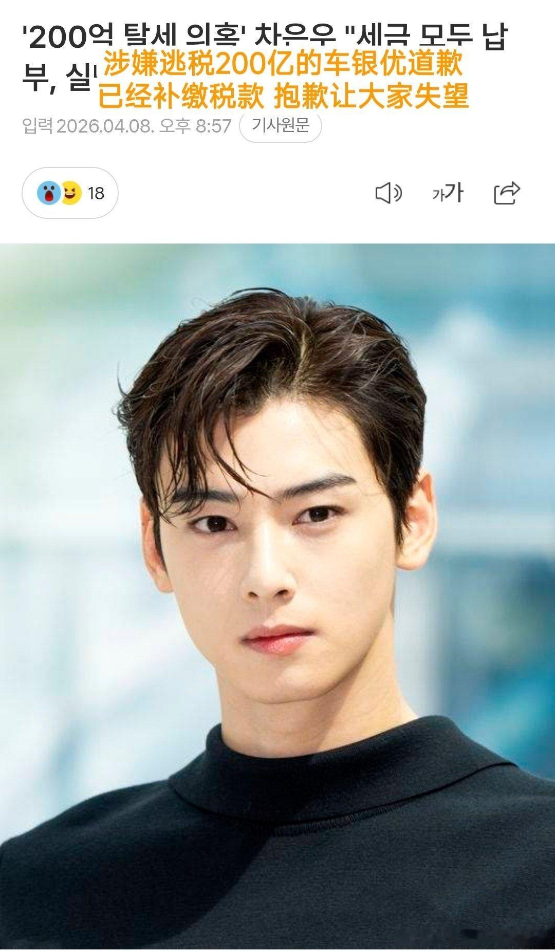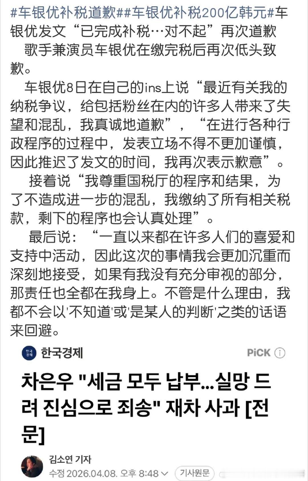 车银优再发文道歉,表示已补清税款,他涉嫌逃漏超过200亿韩元(约人民币9480万)的个人所得税