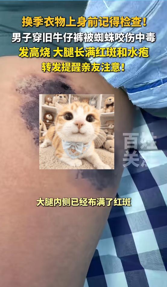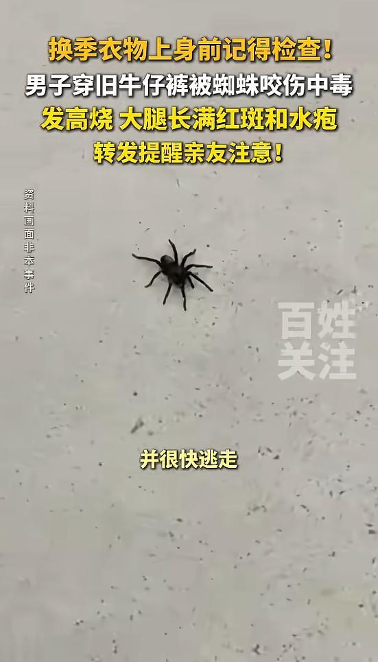 (信息来源:《换季衣物上身前记得检查!男子穿旧牛仔裤被蜘蛛咬伤中毒,转发提醒亲友注意!》百姓关注)