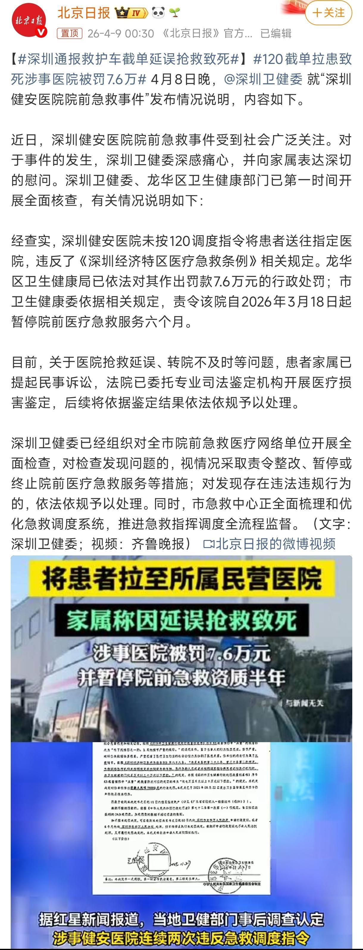 4月9日,深圳卫健委通报健安医院急救事件:救护车违抗120调度,强行转运致患者死亡,罚7.6万元、停急救资质半年 。