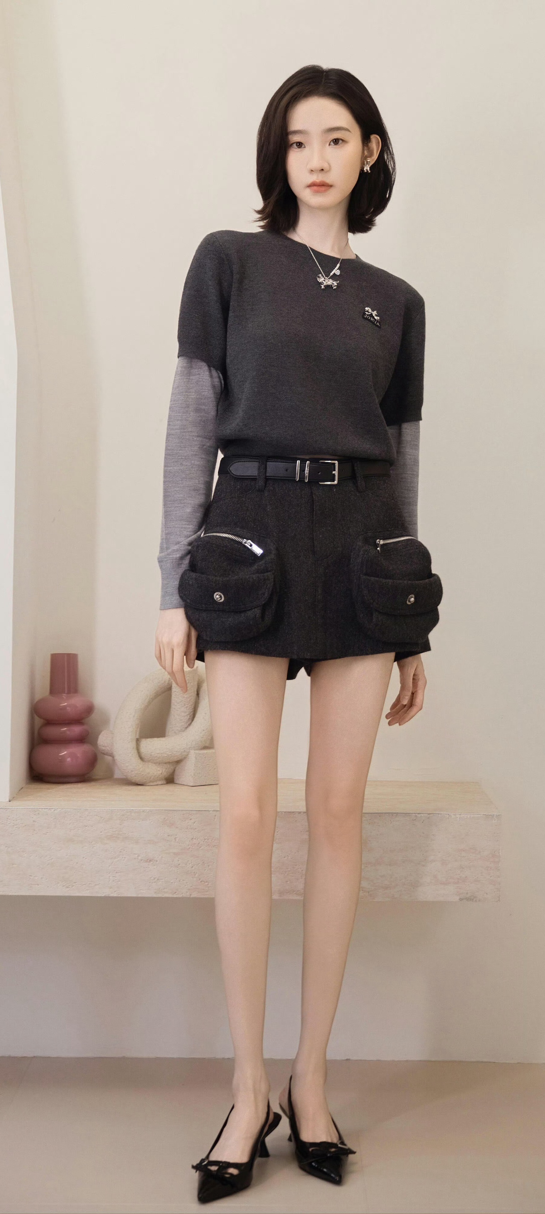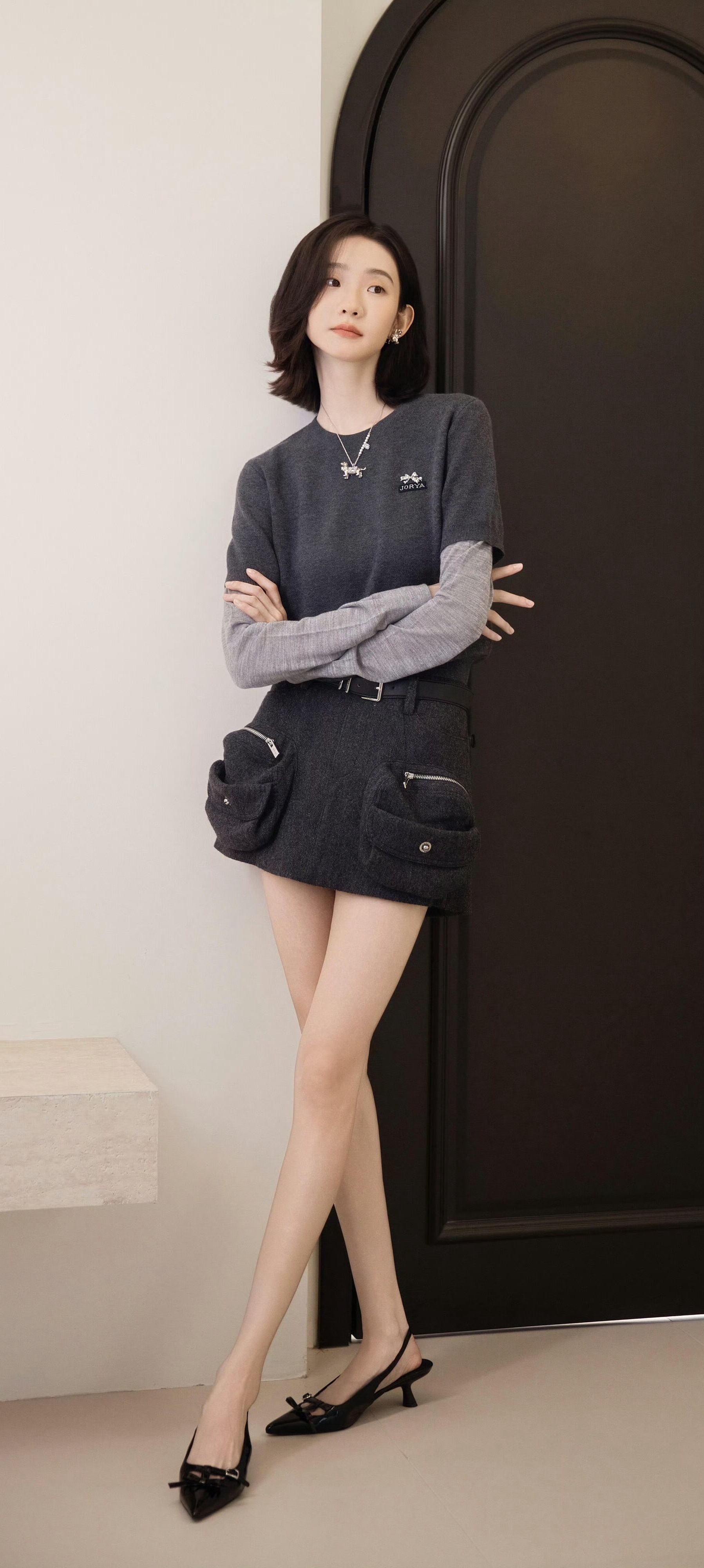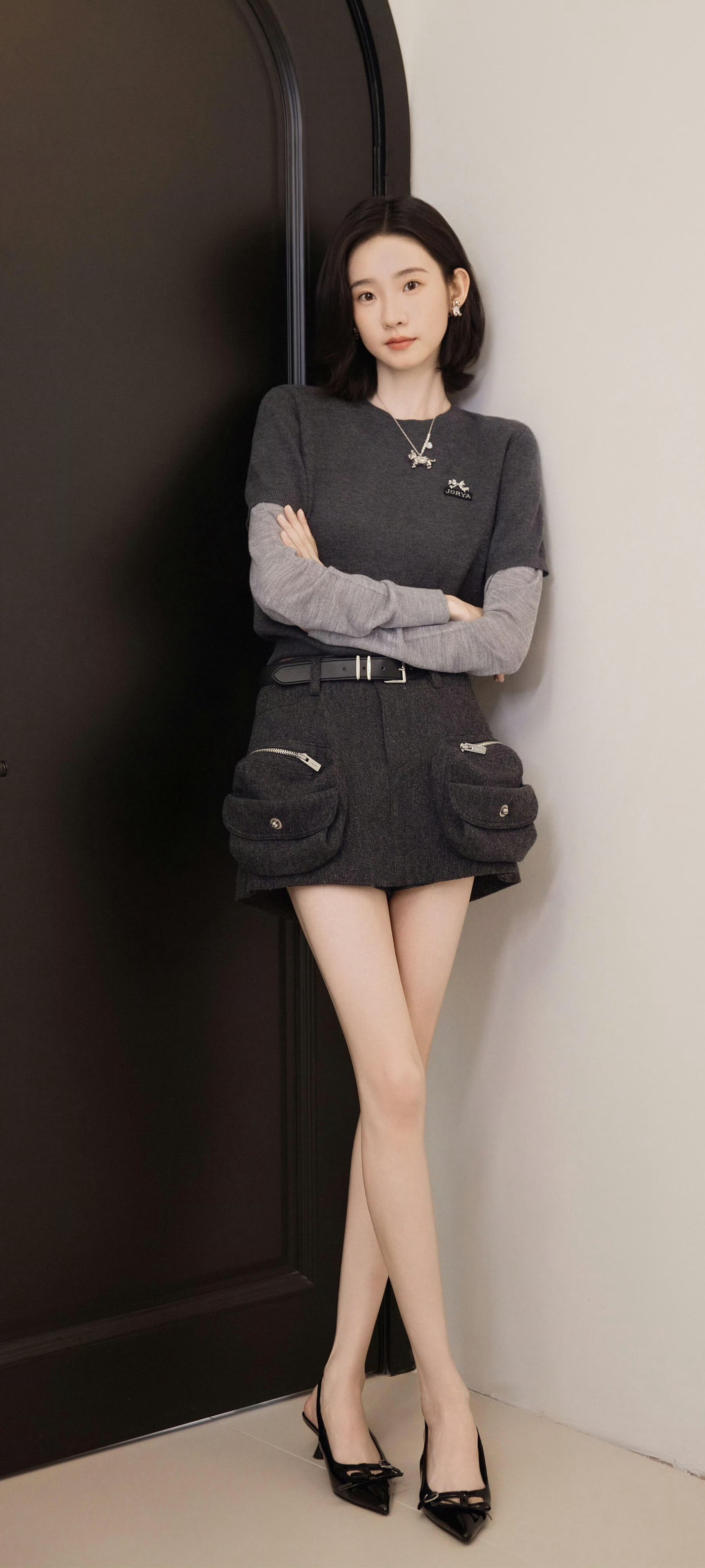 张纯烨全新美腿妆造,一字带高跟,温柔甜美。张纯烨