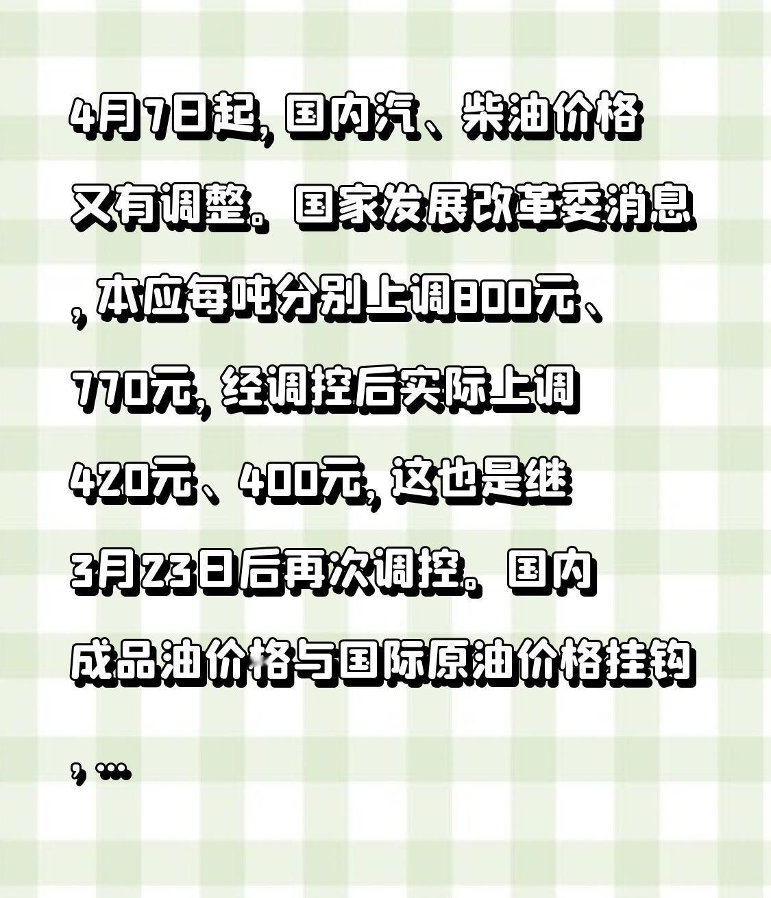 4月7日起,国内汽、柴油价格又有调整。