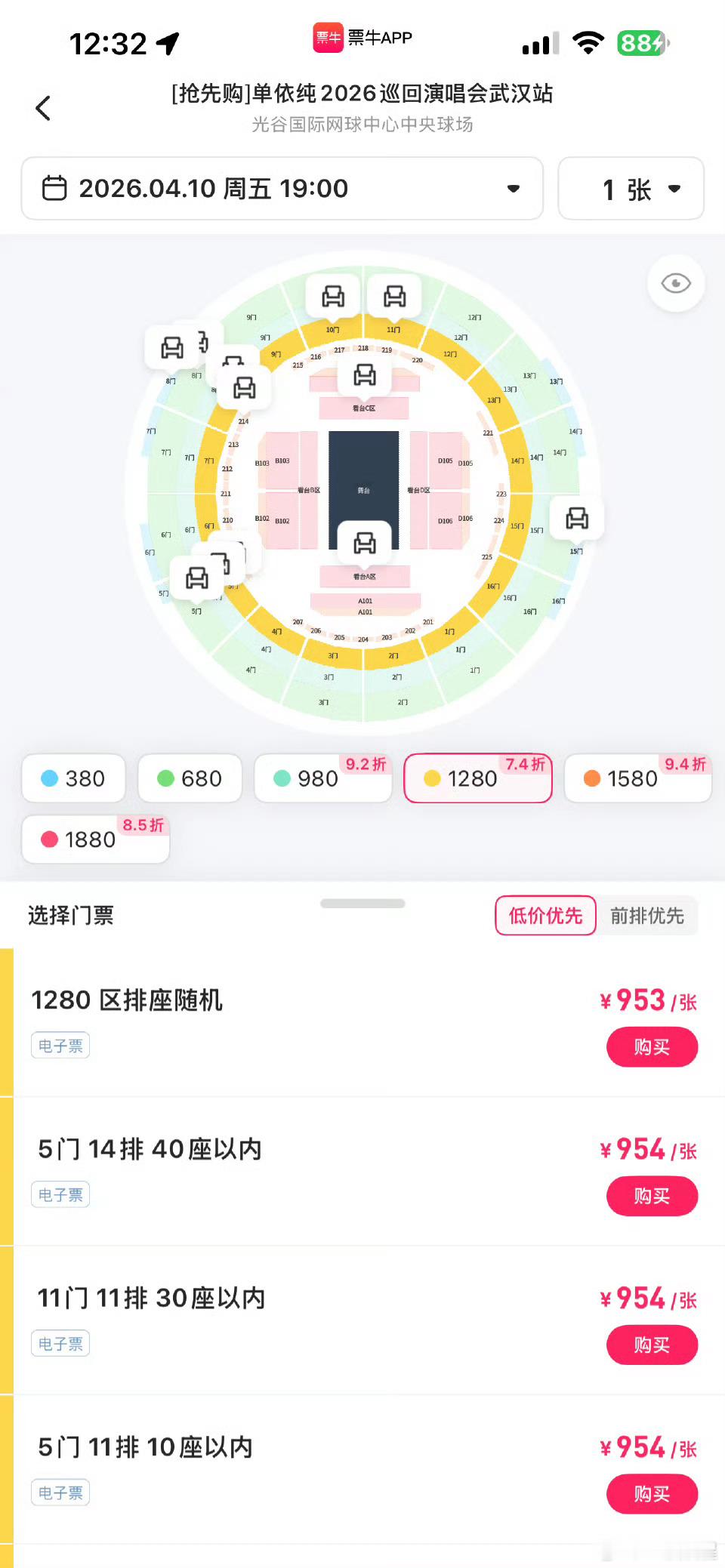 单依纯巡回演唱会武汉站座位票打折了,版权风波还是有点影响的,而且李白这首歌也不能唱了~