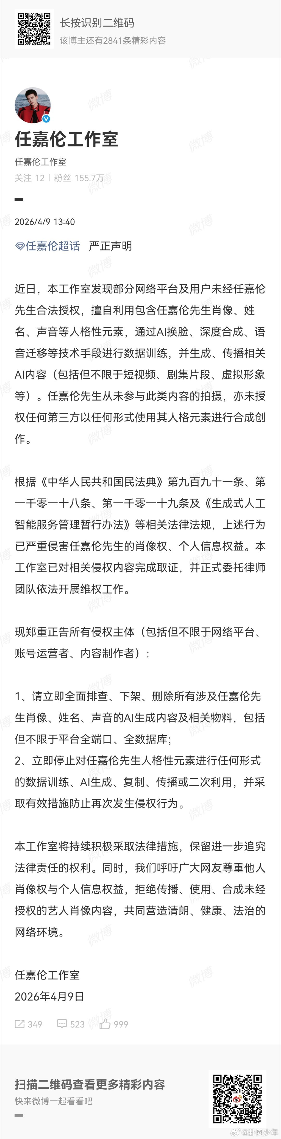 任嘉伦方抵制AI侵权声明任嘉伦工作室AI维权针对未经授权使用AI生成相关内容的侵
