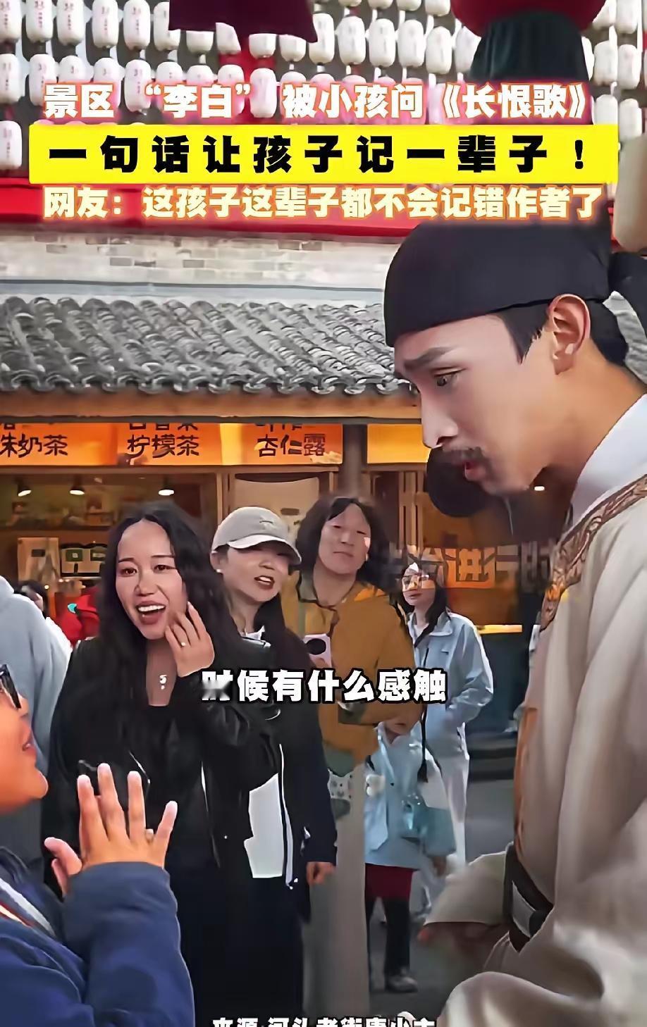 比起课堂上老师枯燥的讲解,孩子在景区里亲眼见到“李白”,亲口问出问题,再被当场纠正,这种记忆点是书本永远给不了的。这个孩子大概率这辈子都不会再把《长恨歌》的作者记错,因为他的记忆里,有“李白”激动纠正的画面,有现场的氛围,有真实的互动,这种沉浸式学习的效果,远超传统的填鸭式教育。