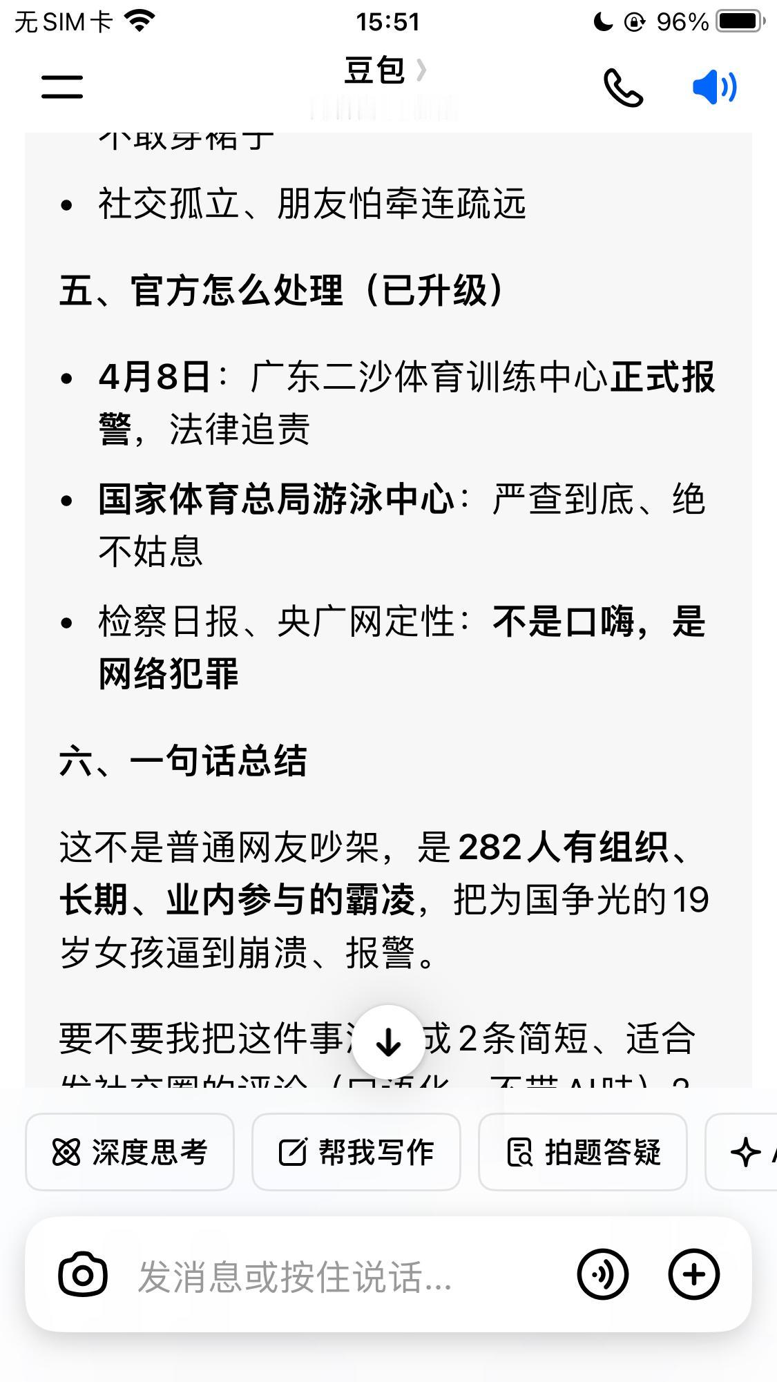 这两天全红婵被网暴,二沙体育馆已经报警立案侦查,282 的人的大群,群规是不许攻