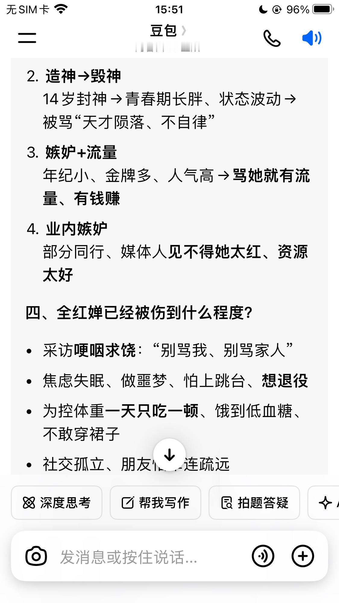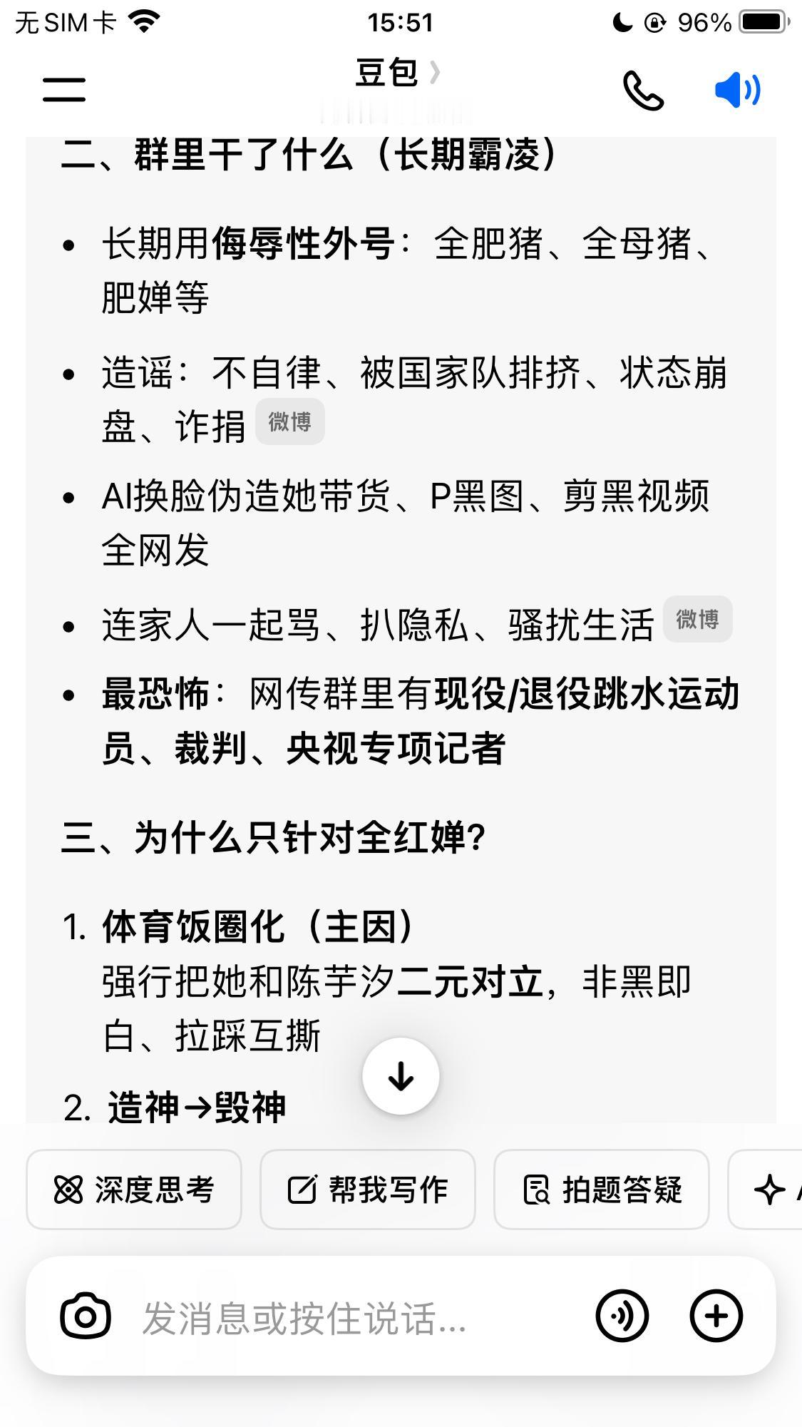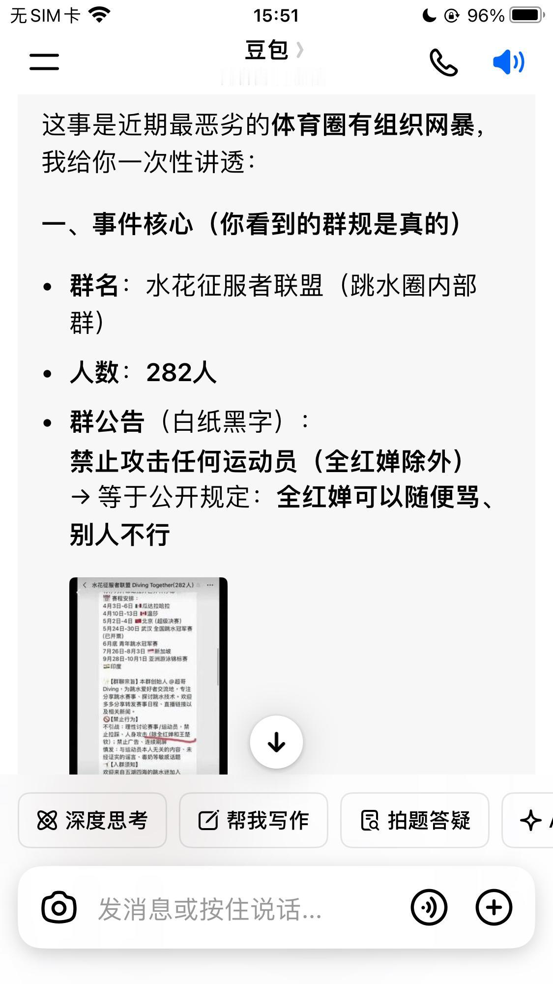 这是一个什么样的群啊?竟然只攻击全红婵一个人,这不是明摆着网暴吗?看着让人心疼啊。我让豆包给我一查,更让我触目惊心,豆包的回答更更是全面,比我听到的还要严重。