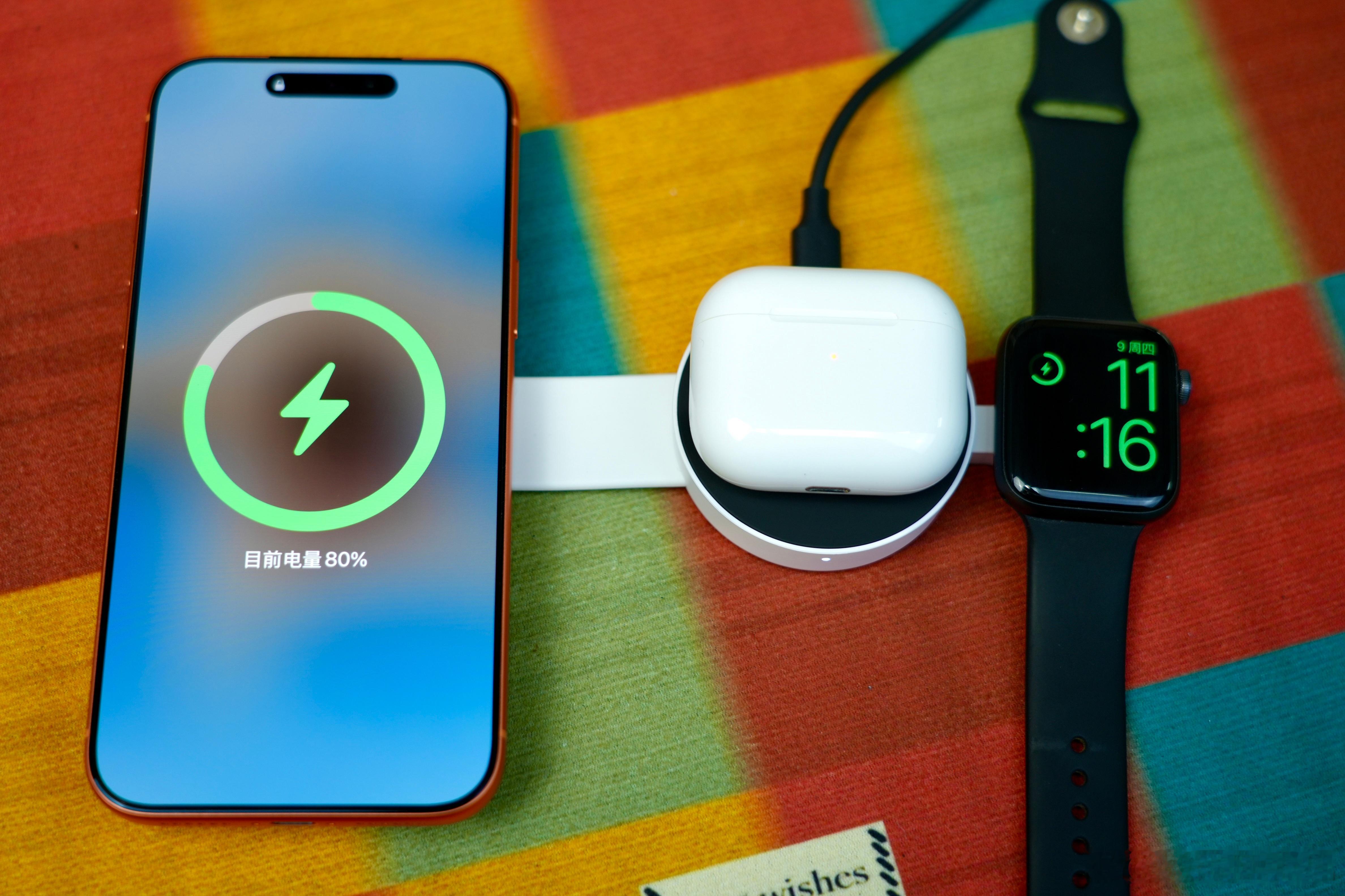 有点东西 到底是谁发明的这种秘制小汉堡三合一便携无线充啊,太懂当代年轻人了吧,我们平常出门除了手机外,耳机和手表也是随身携带,但在办公室或者出差的时候就总要带一堆充电器和线真的好麻烦,主要是会忘记带,这个小汉堡外观顾名思义就是个汉堡造型,装包里不占地方,展开后分别拥有至高15W的磁吸无线充、5W底座无线充和2.5W手表无线充,同时供电一次解决三个设备,就问还有谁?