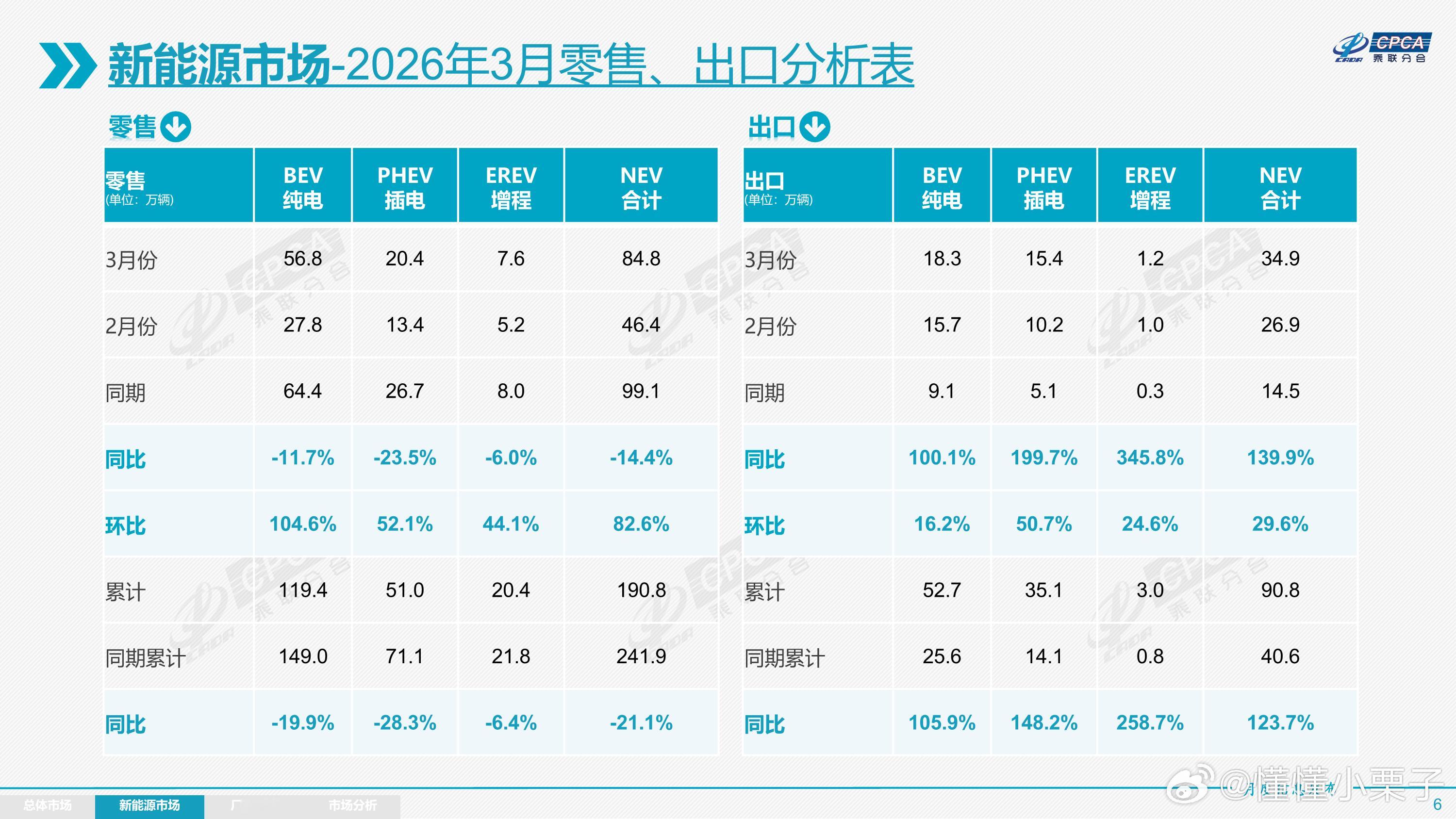 乘联会的数据,3月新能源乘用车市场零售84.8万辆,同比下降14.4%,环比增长82.6%;1-3月新能源乘用车市场零售190.8万辆,同比下降21.1%。月新能源乘用车厂商出口34.9万辆,同比增长139.9%,环比增长29.6%;1-3月新能源乘用车厂商出口90.8万辆,同比增长123.7%。