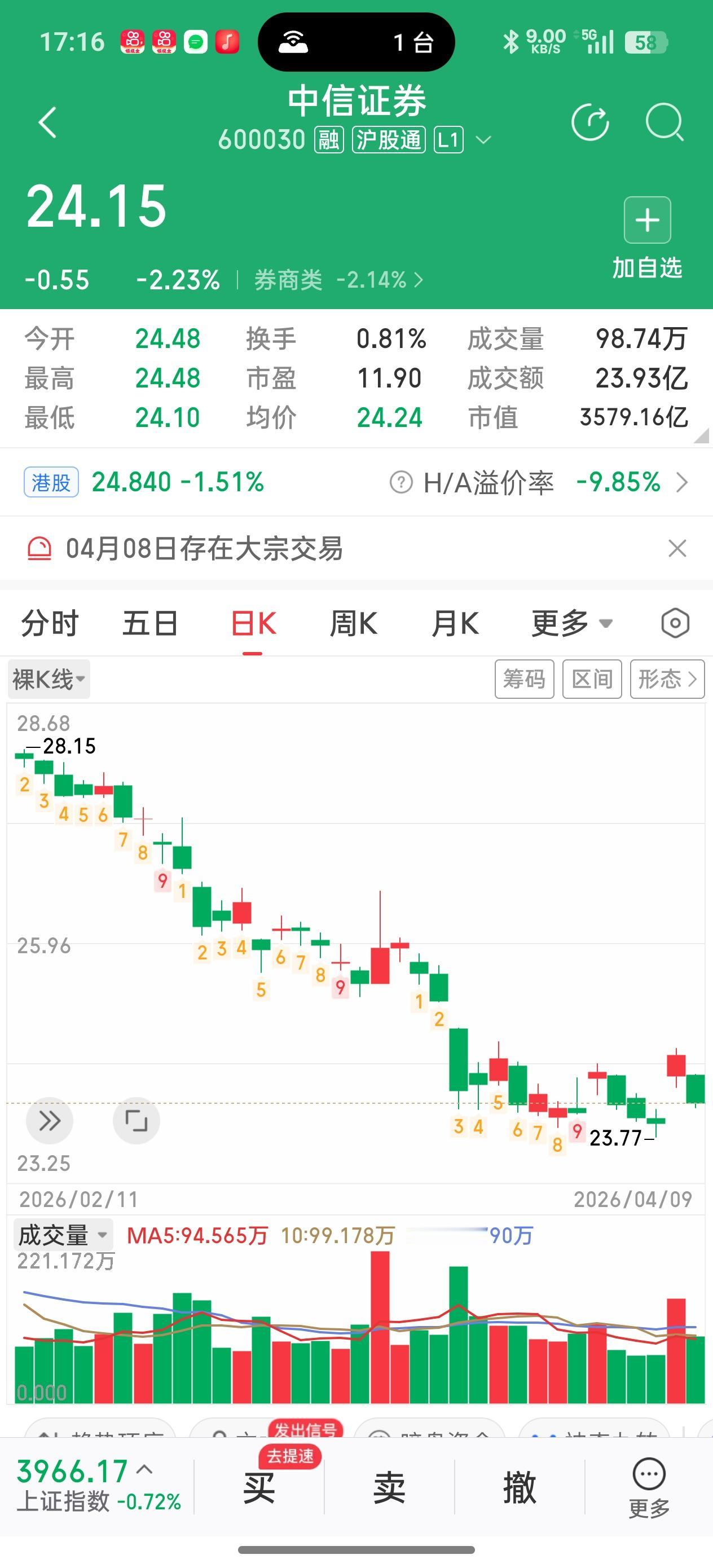 但具有讽刺意味的是,中信证券今天股价收盘下跌2.23%,延续了近期的疲弱走势。