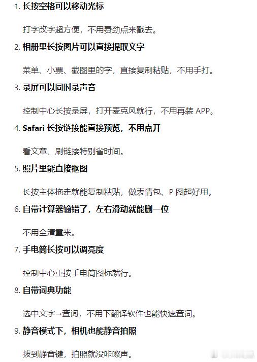 1.长按空格移动光标,改字精准不费劲2.相册长按直接抠图、提取文字,懒人福音3.计算器输错左右滑,删一位不用清零4.重按手电筒可调亮度,细节超贴心5.Safari 长按链接预览,省点省时间6.录屏长按开麦克风,声音画面一起录7.静音键一拨,拍照也能悄悄无声8.跨苹果设备复制粘贴,无缝接力超丝滑