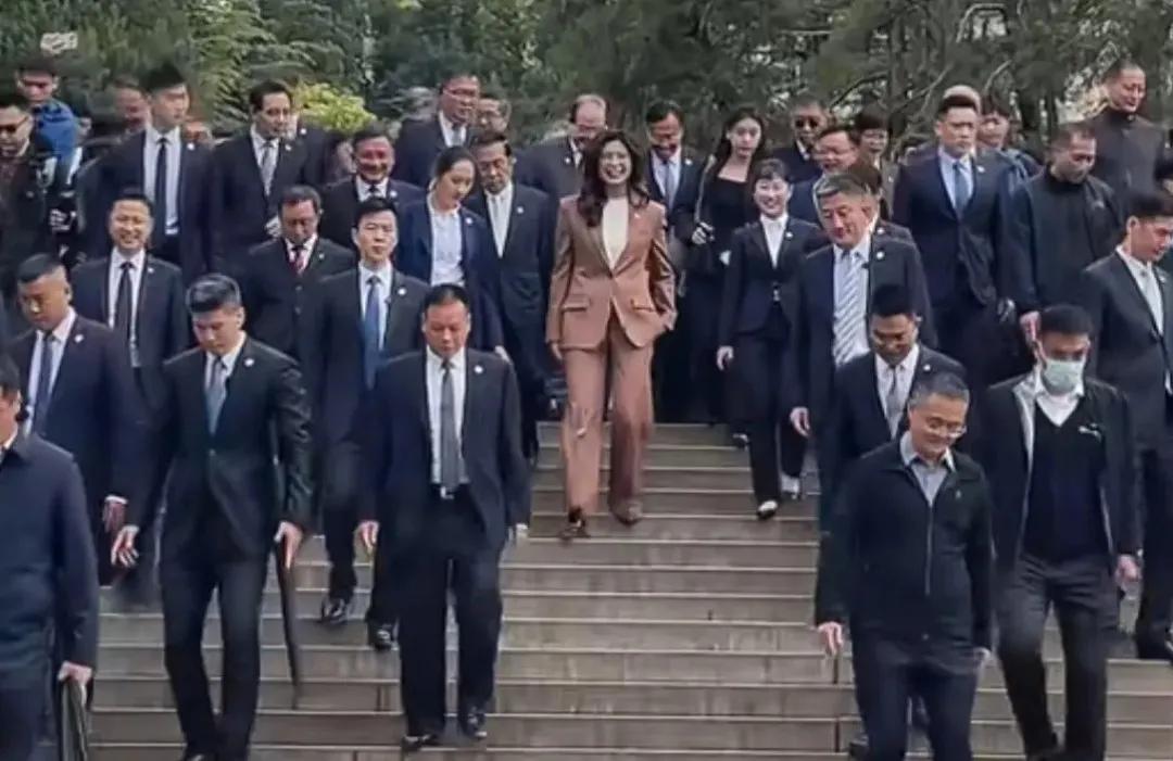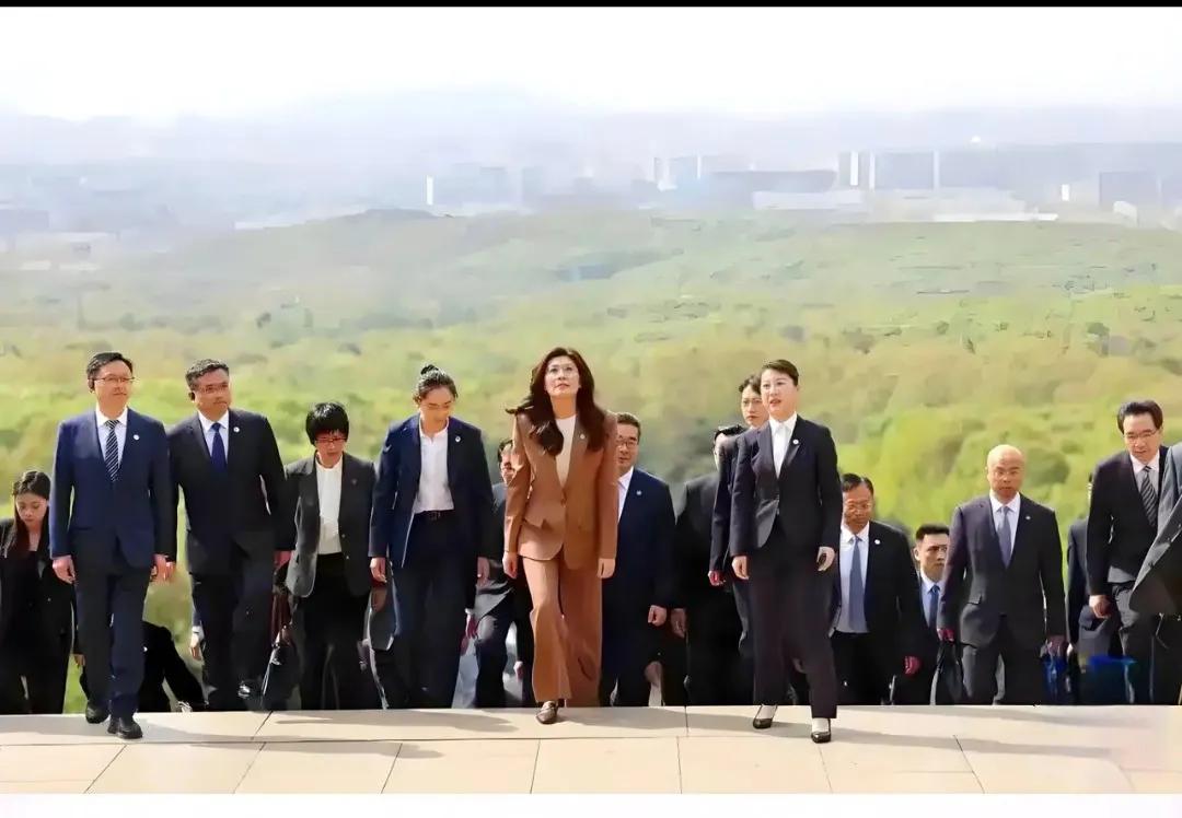 南京中山陵,陵墓占地之空旷,392石级为瞻仰者热身,设身处地必有各人的感触想法。高䠷的郑丽文女士此刻的身份特殊热度空前,双手放裤袋可能是藉此放松展示自然的走姿,毕竟目前于内陆大地好评如潮,能言善道。