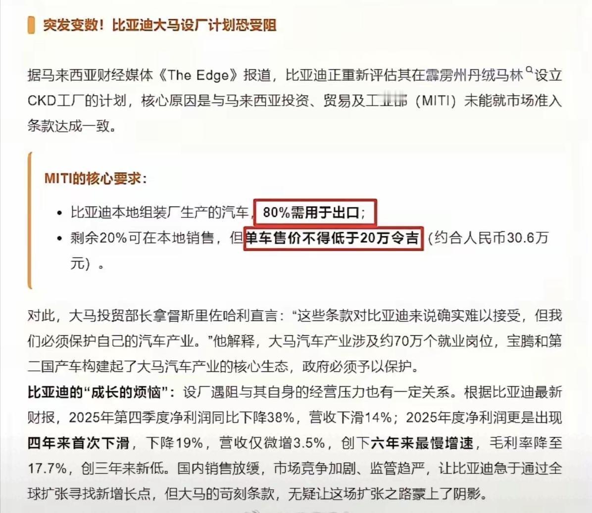 马来西亚给比亚迪开出了一张 “屈辱条约”。2026 年 3 月 30 日,马来西亚投资、贸易及工业部部长亲自放话:比亚迪在当地组装的车,80% 必须出口,剩下 20% 每辆售价不能低于 20 万令吉,折合人民币 30.6 万元。