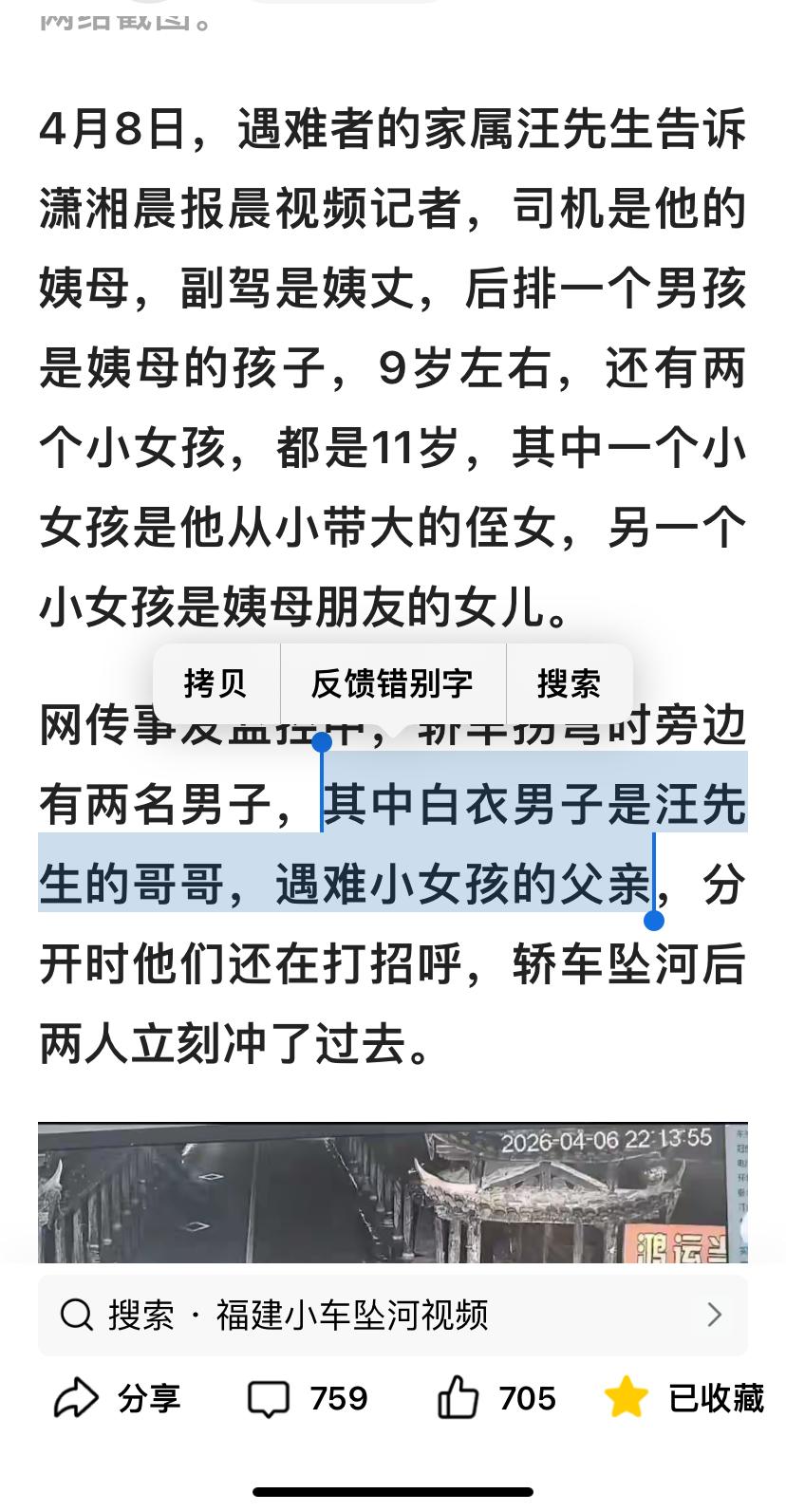 3、视频中穿白衣男子是遇难小女孩的父亲,也是汪先生的哥哥,他们与女司机是亲戚,女司机主动提出捎女孩回家的,父女俩刚打完招呼分开,没想到轿车就坠河了,其父亲眼睁睁地看着女儿在轿车里坠入河中却无能为力该是多么痛彻心扉啊,女孩母亲前一分钟还和女儿通电话,后一分钟就与女儿天人永隔,余生怎么活啊