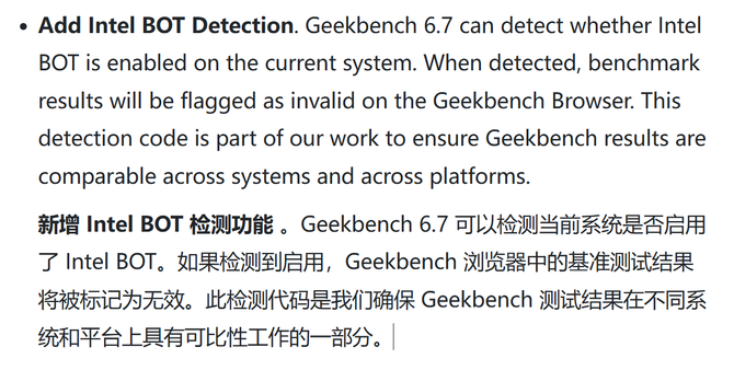 4月9日消息,PrimateLabs推出GeekBench6.7版本,重点引入针对英特尔二进制优化工具BOT的检测机制。该版本能精准识别系统是否启用了BOT,一旦检测到激活状态跑分结果将被标记为无效。